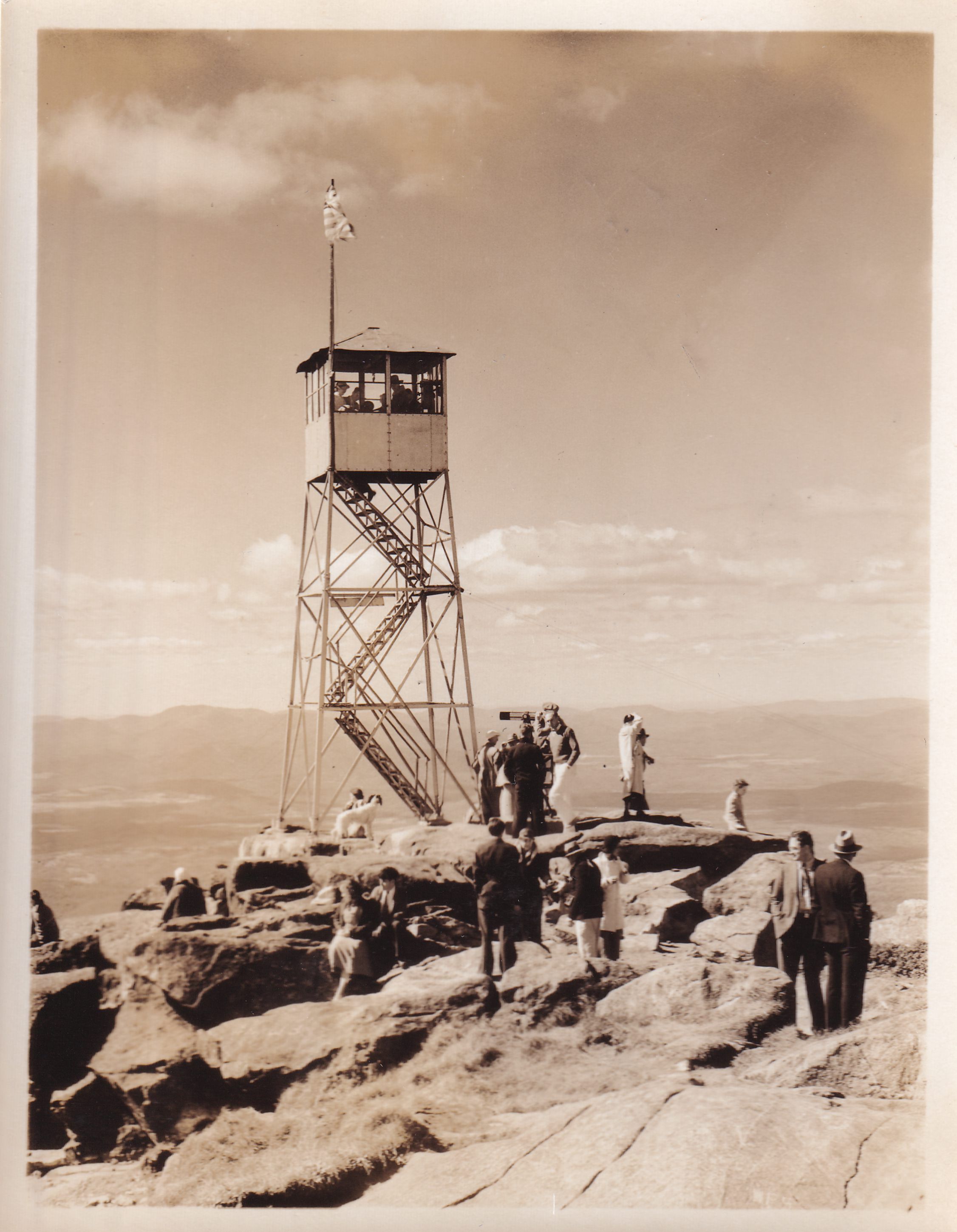 Photograph of the fire tower on Whiteface Mountain. People can be seen standing on the rocks around the tower and up in the tower. Taken the day of the dedication for the memorial highway.