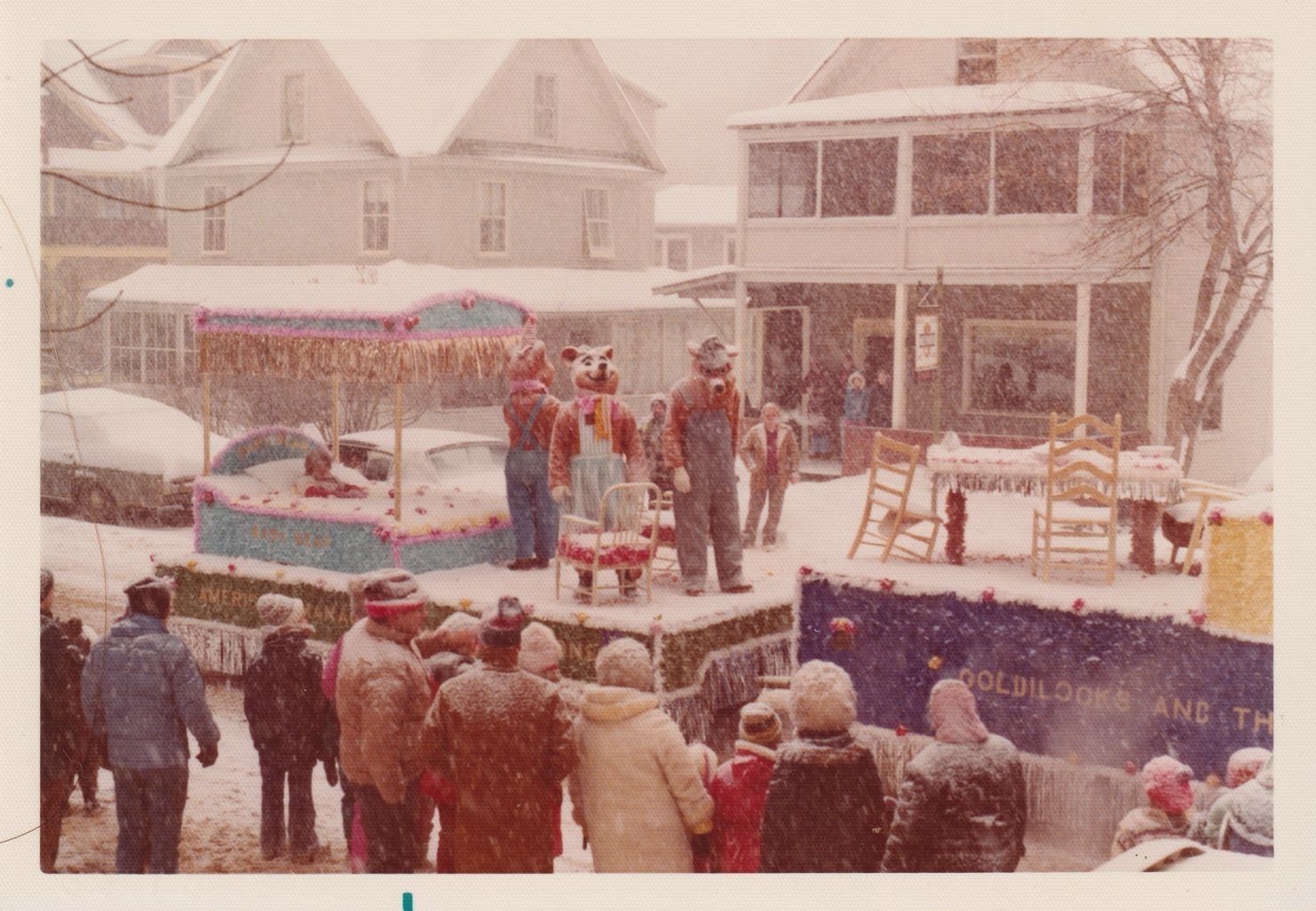 Color photograph of a Winter Carnival float in the middle of a snowy road. The float says "Goldilocks and the Three Bears" on the front half, while the back has three people dressed as bears standing next to a bed with a woman laying on it. This photograph is from an album of photographs taken by staff of the American Management Association.
