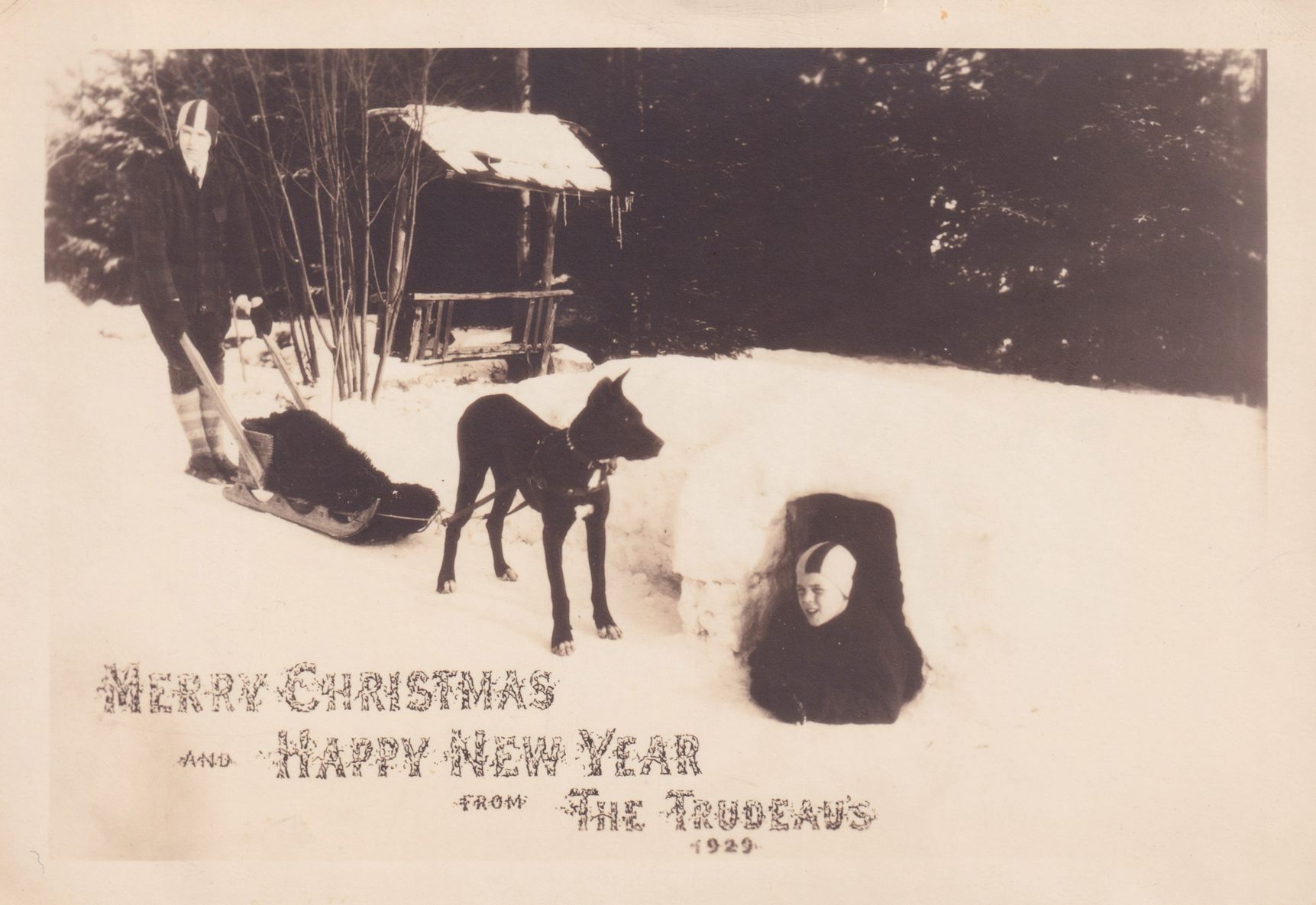 Black-and-White photograph Trudeau Family Christmas card showing Edward L. and Frank Trudeau in the snow. Edward is standing behind a small sleigh harnessed to a dog, and Frank is lying inside the entrance of a snow fort. Printed on the card is, “Merry Christmas and Happy New Year from the Trudeau’s, 1929.” Postcard backing, unused.Subject Person/Organization