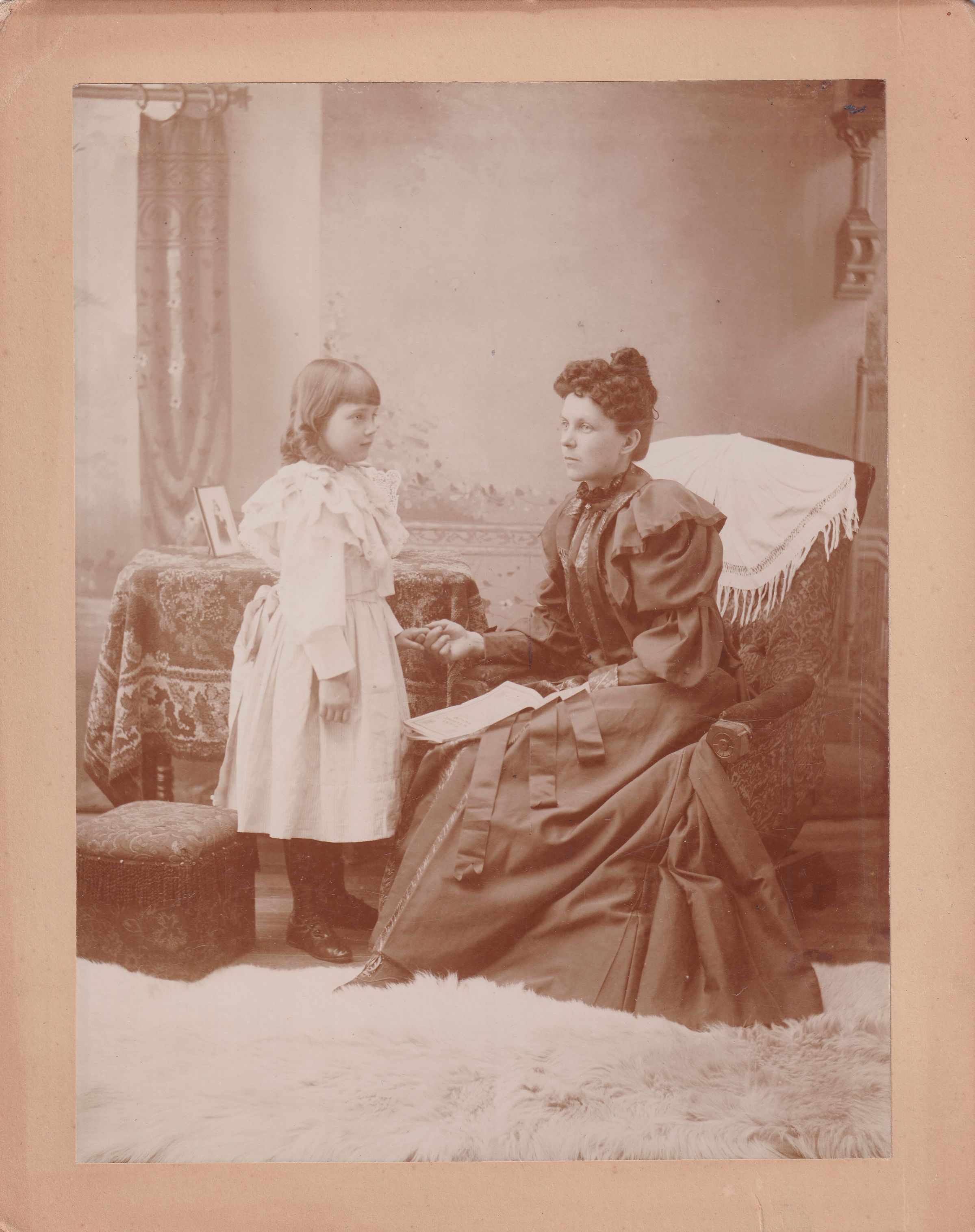 Studio portrait of Mary Ellen Smith with her daughter, Dorothy Blanche Smith, around 1890. Blanche is standing at left, and Mary Ellen is seated at right. They are holding hands. There is a carpet-covered table behind them. The photograph is mounted on a tan card.