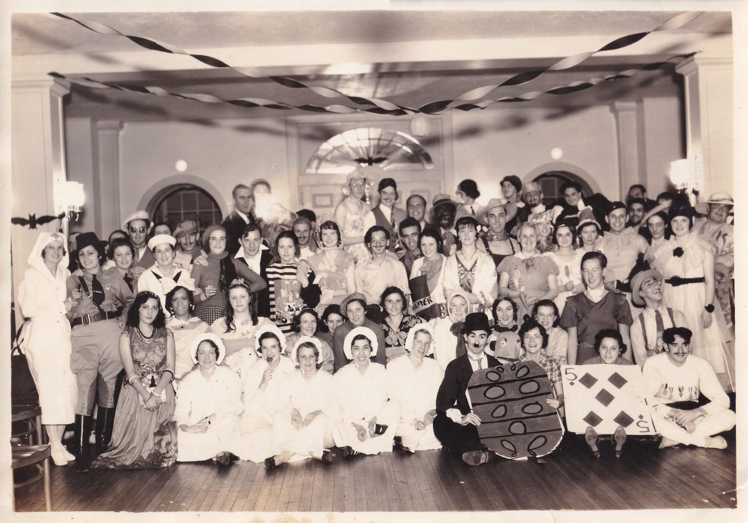 Photograph of patients at the New York State Hospital for Incipient Tuberculosis, AKA Ray Brook Sanatorium dressed in costumes for Halloween. Handwritten note on back reads, "Oct. 31, 1933."