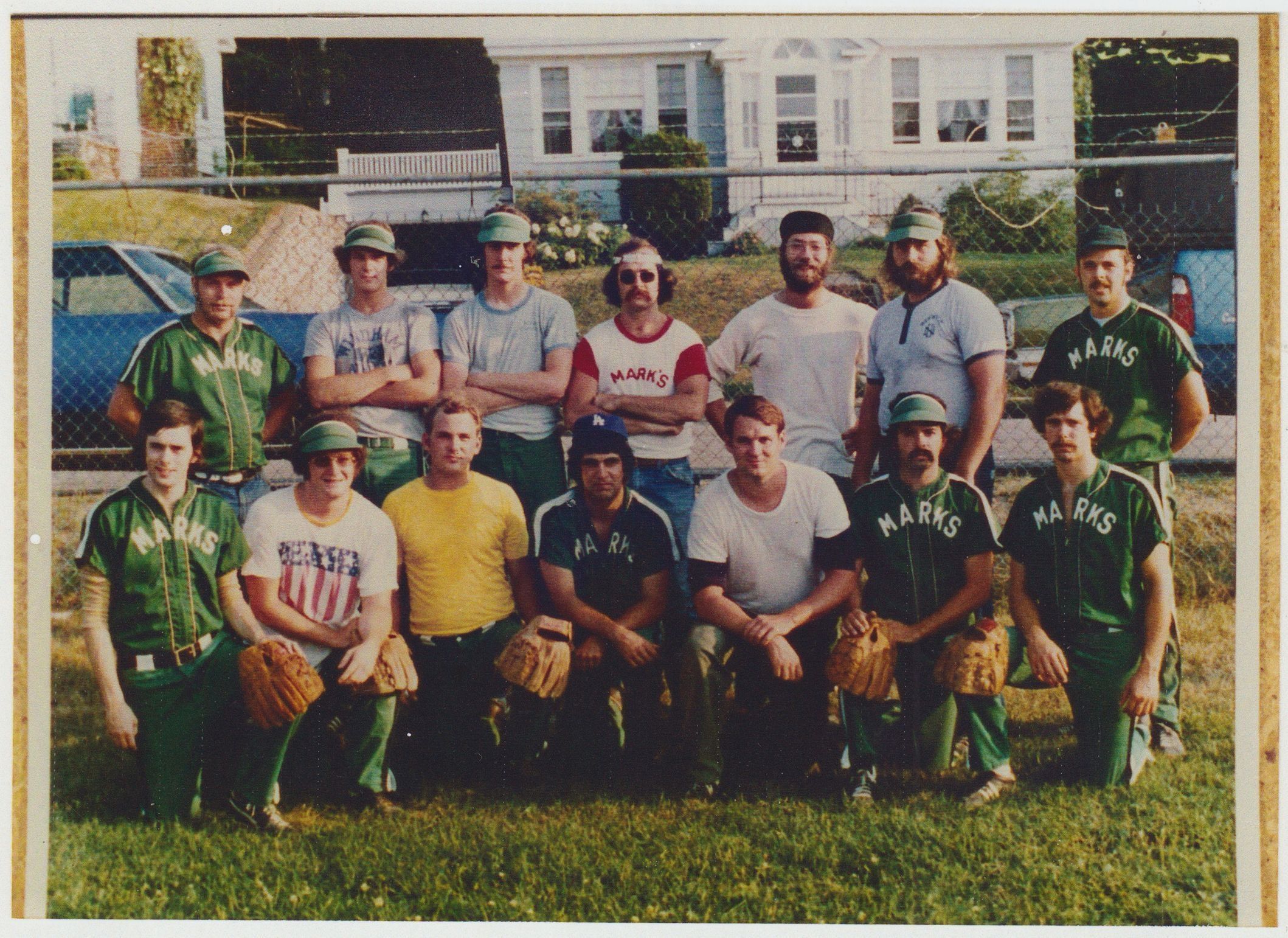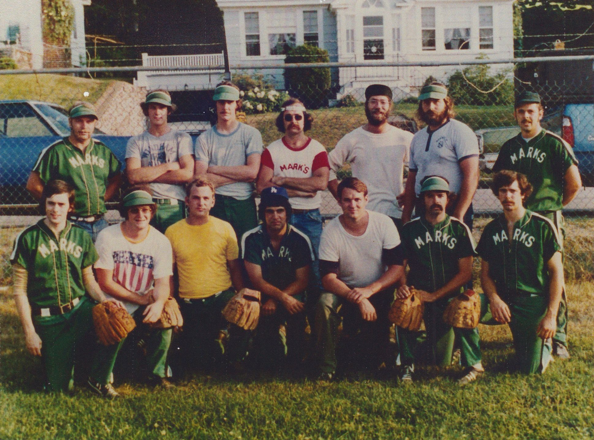 Color photographic reproduction of a photograph of the "Mark's Bar" 1975 Black Fly Softball League team. There are two rows of men, one crouching and one standing, in front of a fence. Houses on Petrova Avenue are visible behind the fence. Some of the men are wearing green jerseys that say "Marks." Identification provided by the donor labeled the photograph, "1975 Black Fly Softball League, Mark's Bar, Sponsored by Vinnie Pelletieri." The front row (left to right) is identified as "Jim Clark, Jim Reichhart, Lyle Branch, Rik Cassidy, Ed Goetz, Clarence 'Twerp' Amell, Jim Whitelaw," and the back row, "Tom Hotaling, Bert Hough, Dennis Bristol, Ken Roberts, Stafford Branch, Neil Olsen, Matt Schroeder."Made/Created