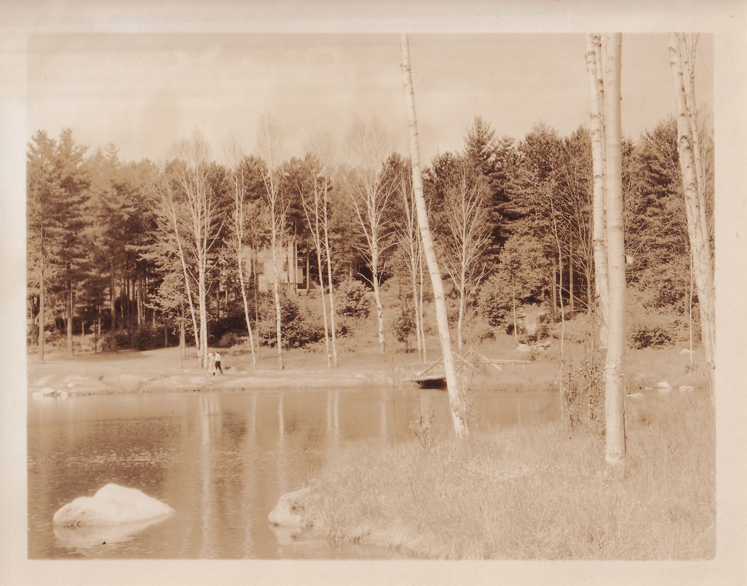 Black-and-White photograph of a view across a body of water, likely the duck pond at the New York State Sanatorium for Incipient Tuberculosis. Several people can be seen walking on the opposite side of the pond.