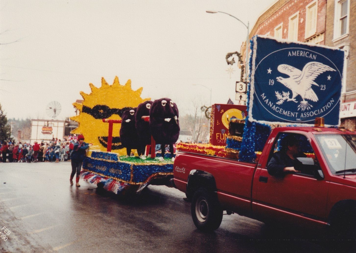 Color photograph of American Management Association's float for the Winter Carnival parade. There are people dressed as raisins standing on the float, which has a large sun and raisin box on it as well. This photograph is from an album of photographs taken by staff of the American Management Association.