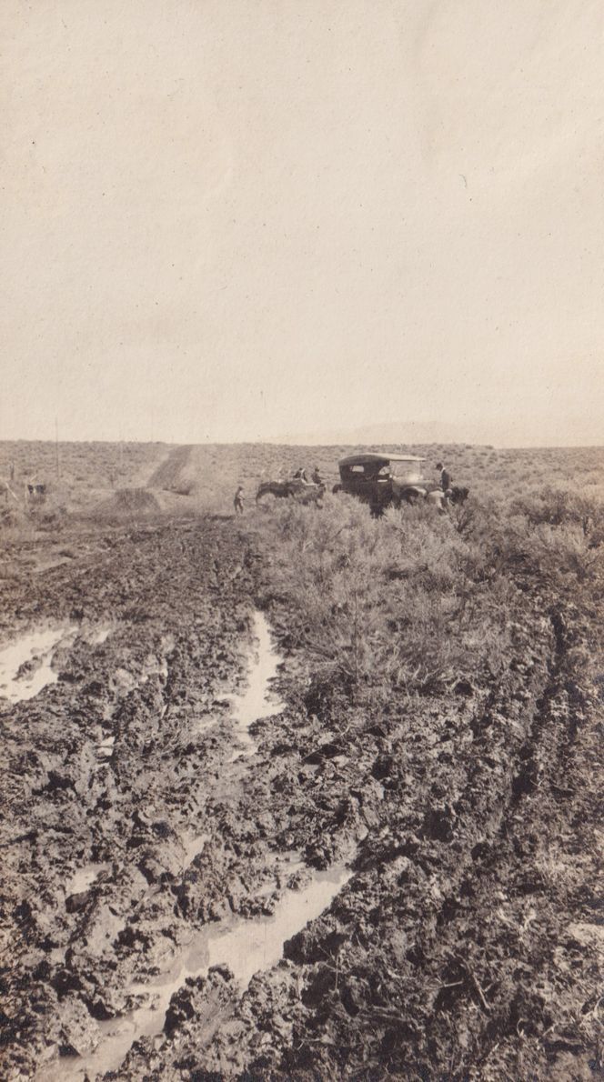 Black-and-white photograph of flat scrubland with a car parked on a road running through the landscape. There is also someone leading a horse.
