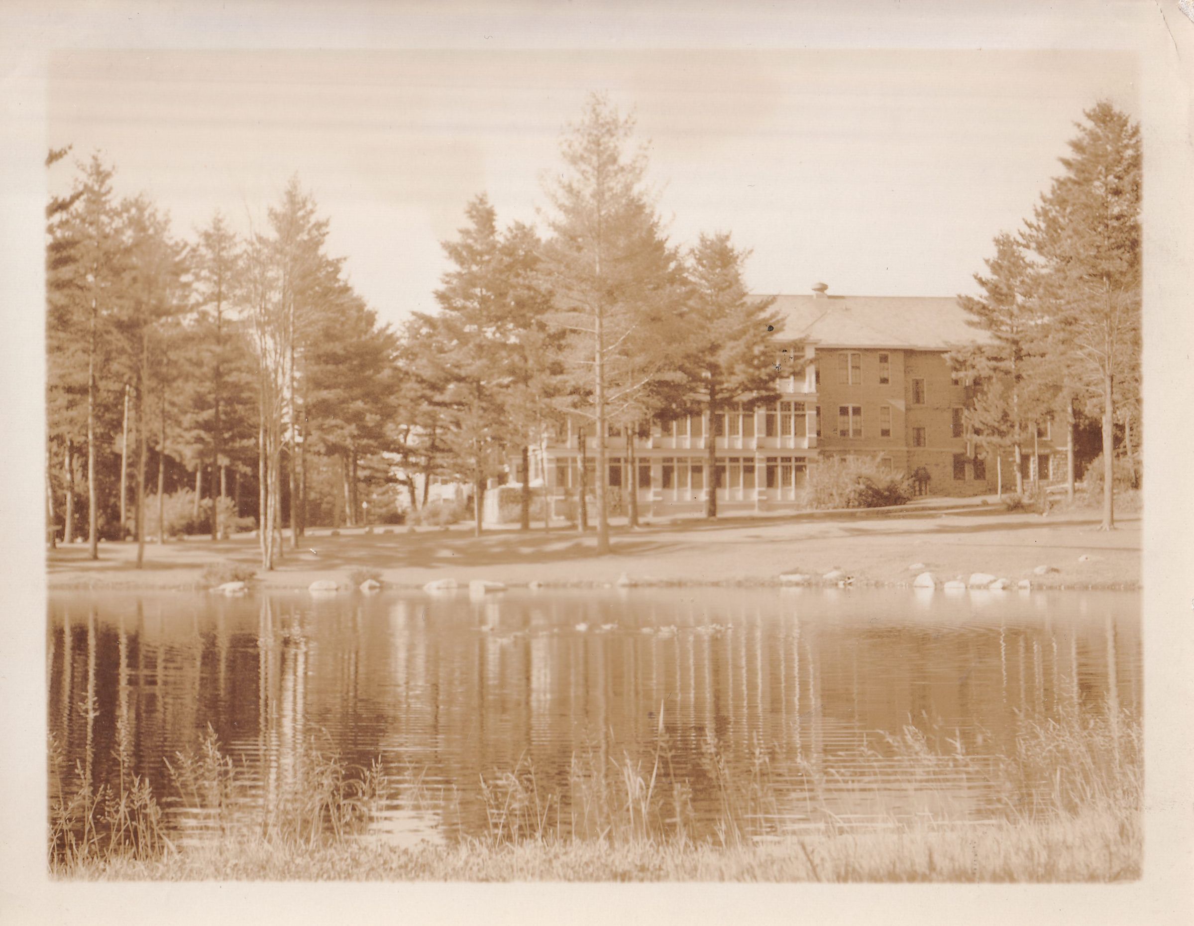 Black-and-White photograph of the view across the duck pond at the New York State Hospital for Incipient Tuberculosis, with the Main Building in the background.