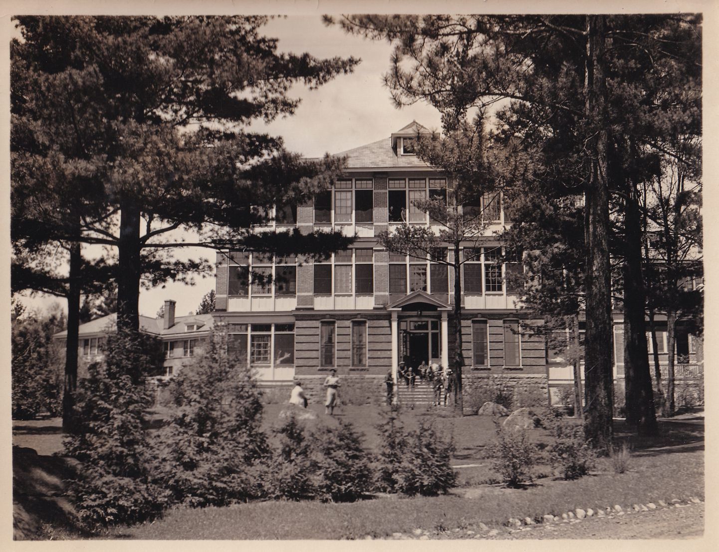 Black-and-White photograph of the Pryor/west/men's wing of the Main Building at the New York State Hospital for Incipient Tuberculosis, as seen through the trees. There are patients on the lawn and steps of the wing.
