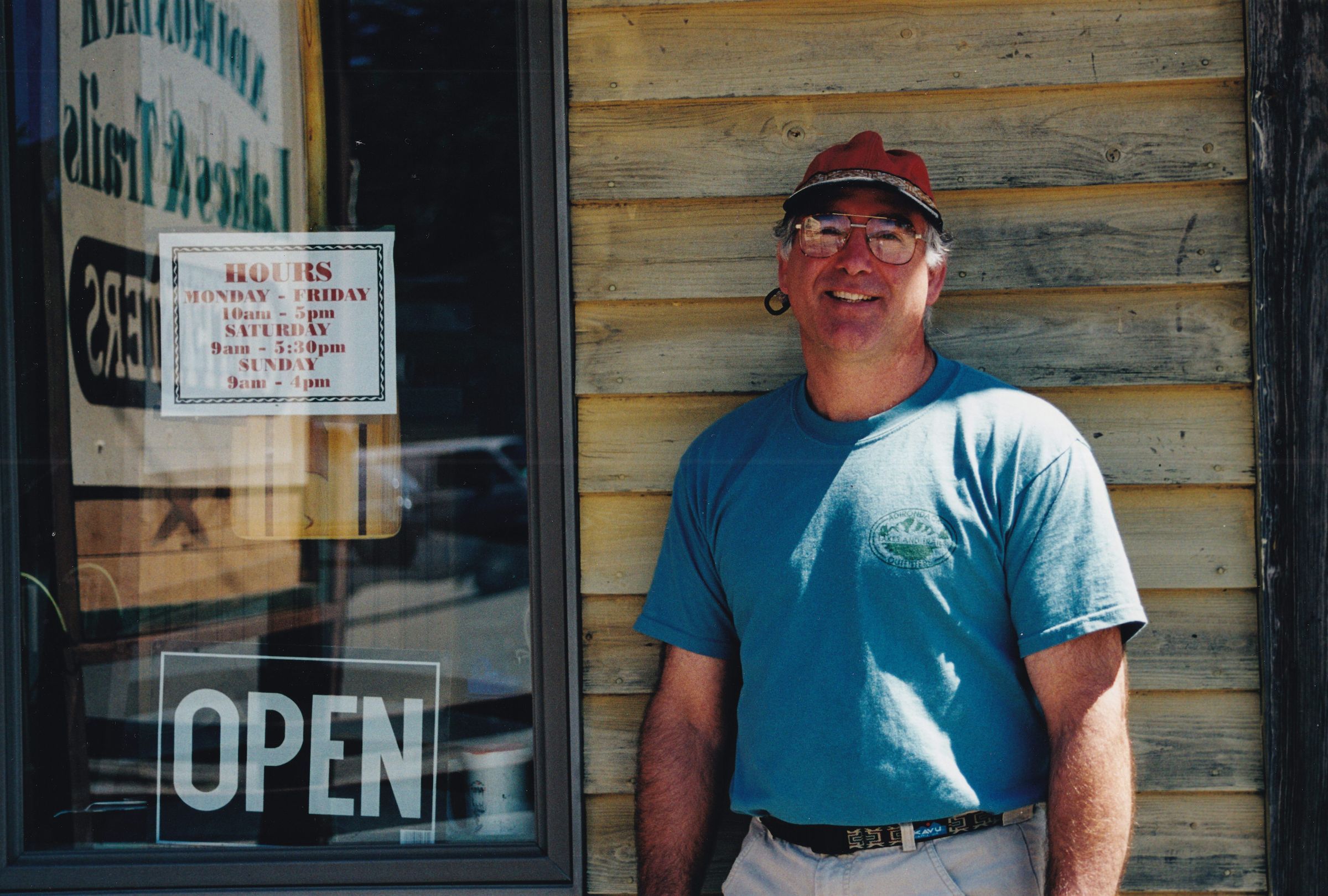 Color photograph of Steve Doxon outside of his business, Adirondack Lakes & Trails Outfitters. Portrait taken by Mary Lou Hanpeter Banks as part of her Soul Proprietor exhibition.