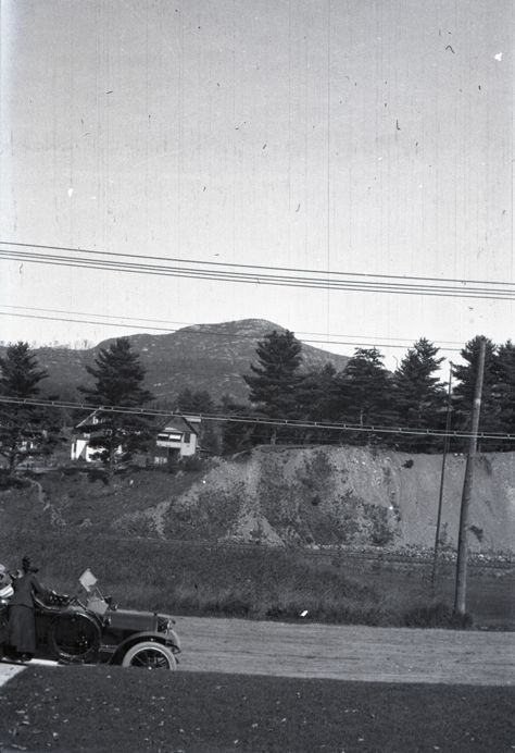 Negative of a road with a car in the lower part of the image and a house and mountain in the upper half and background. There is a woman leaning into the car. Most likely taken by Mary Ives Baldwin. This item is not fully cataloged but has been uploaded so the image is publicly available; if you would like us to prioritize cataloging this item, please contact the HSL Collections team.