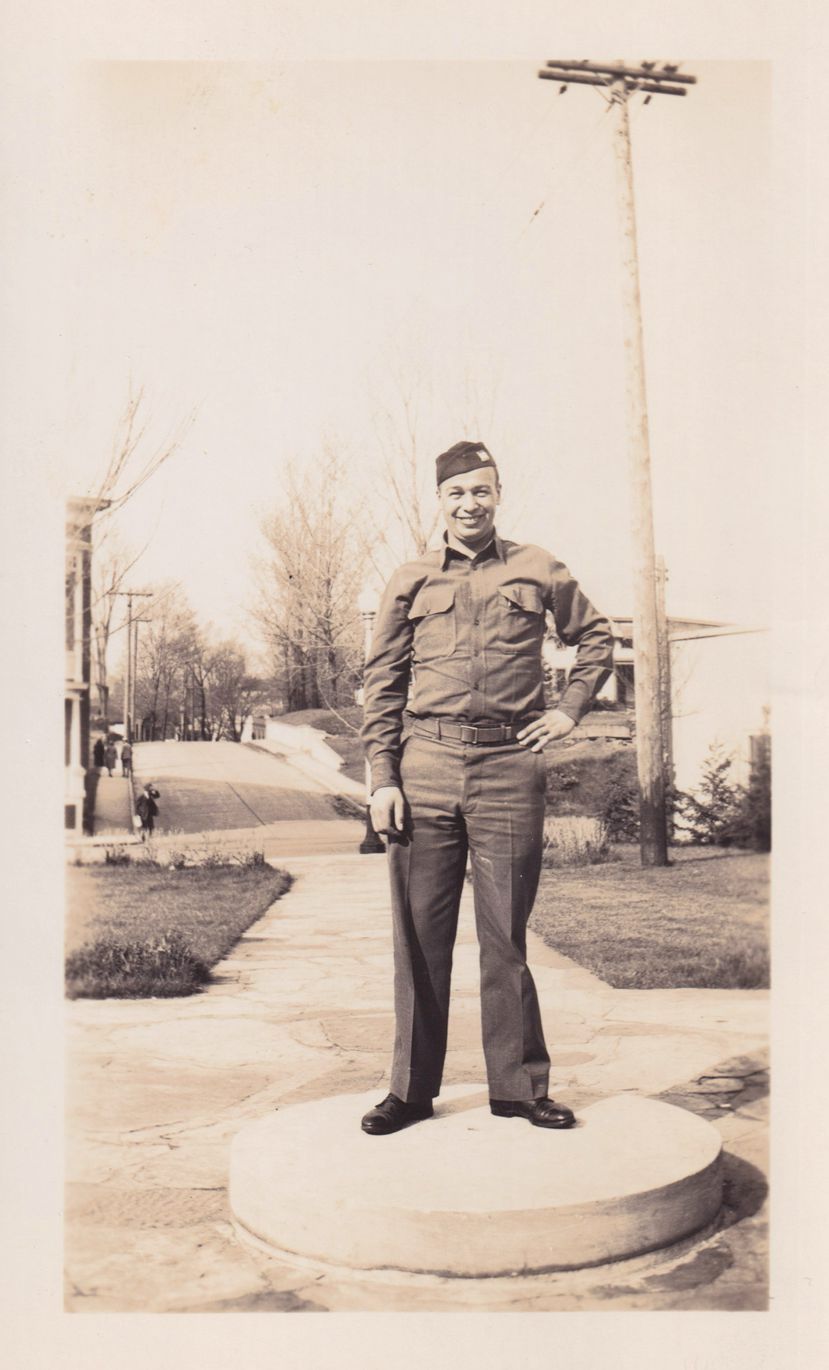 Black-and-White photograph of a man in military uniform standing in what appears to be a park. He is standing on a small concrete platform. The photograph was likely printed by Kollecker's Kodak and Gift Shop.