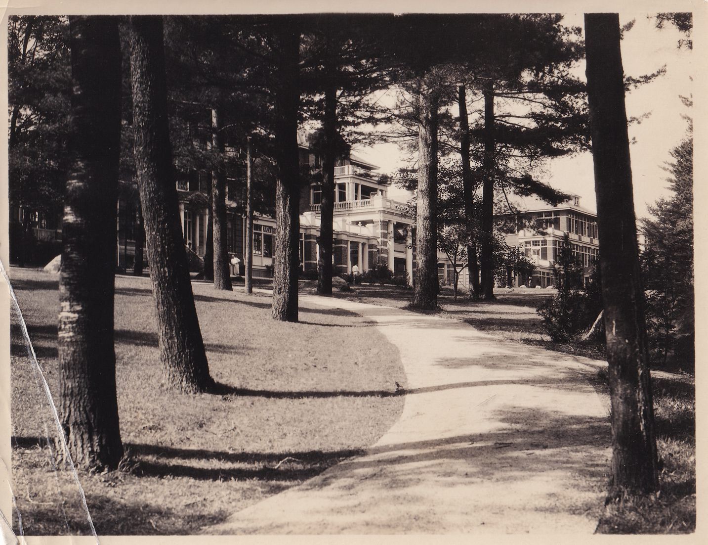 Black-and-White photograph of the view up the road toward the Main Building at the New York State Hospital for Incipient Tuberculosis.