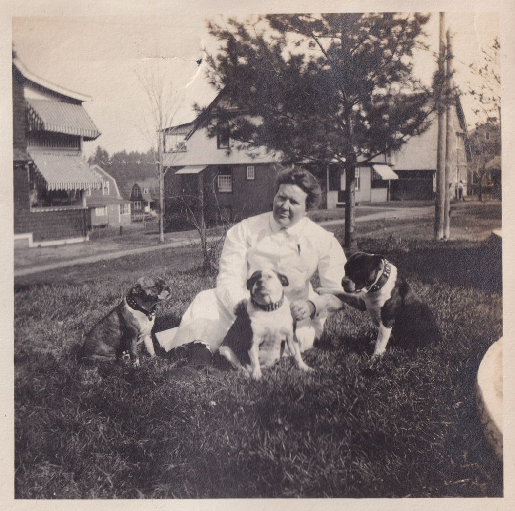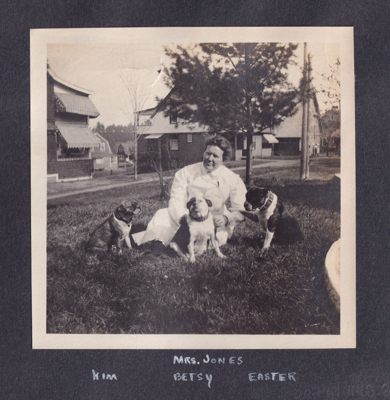 Black and white photograph of a woman sitting outside with three dogs sitting around her. Houses can be seen behind her. Beneath the photo there is the caption, "Mrs. Jones, Kim, Betsy, Easter."