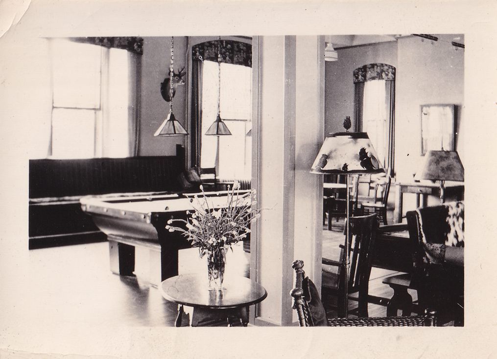 Black-and-White photograph of a lounge at the New York State Hospital for Incipient Tuberculosis. There are several seating areas and a billiards table visible.