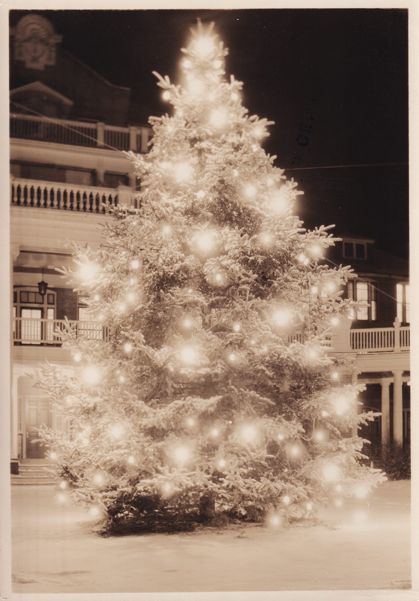 Photograph of a large evergreen tree decorated with lights for Christmas in front of the main building at the New York State Hospital for Incipient Tuberculosis, AKA Ray Brook Sanatorium. The front entrance can be seen behind the tree, and there is snow on the ground. Handwritten note on back reads, "Christmas, Ray Brook."