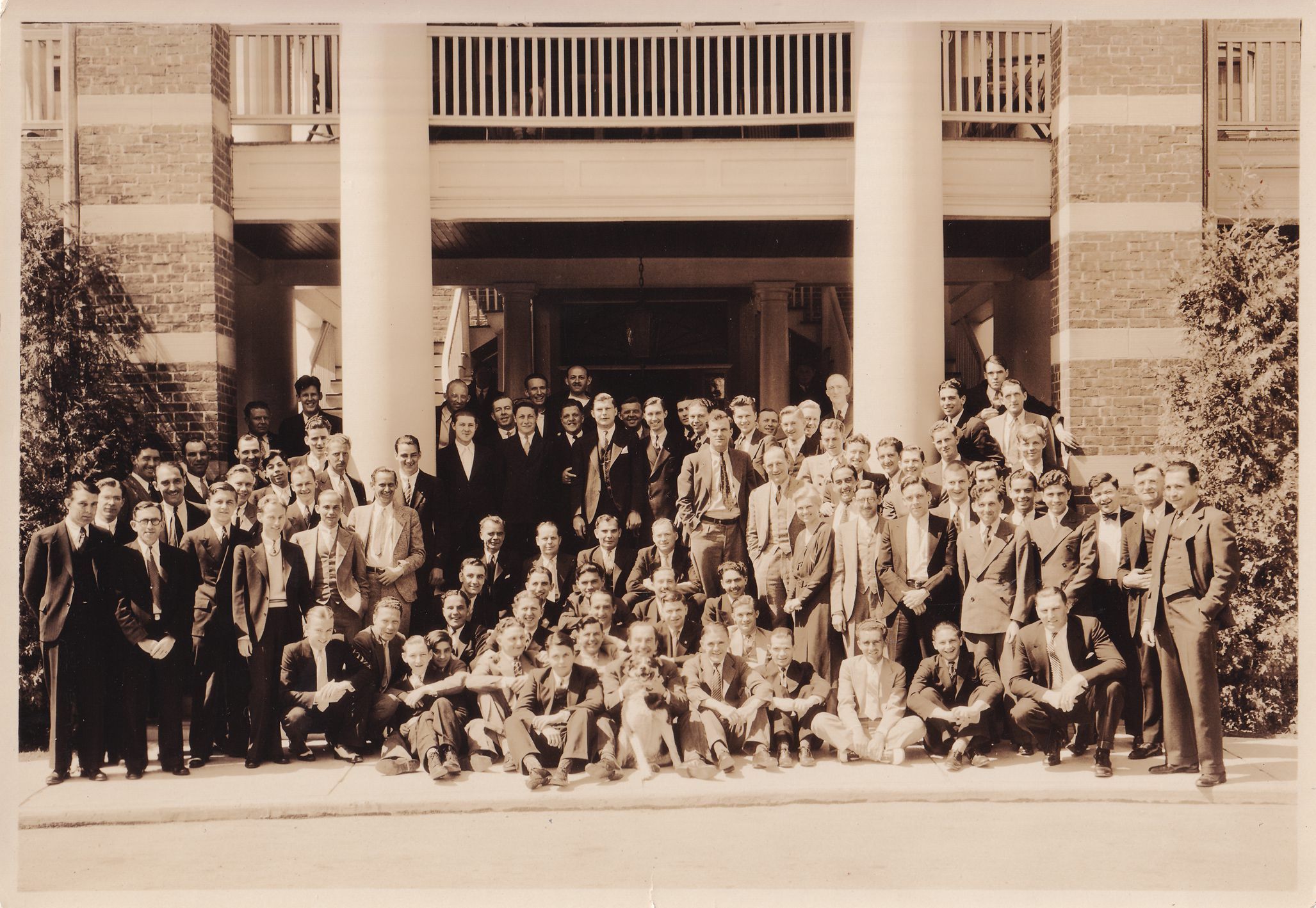 Photograph showing a large group of men, likely patients, at the New York State Hospital for Incipient Tuberculosis, AKA Ray Brook Sanatorium. Patients are standing and seated in the front entrance of the main building. There is a dog at the center of the front row. Handwritten note on back reads, "Patients at Ray Brook, 1933?"