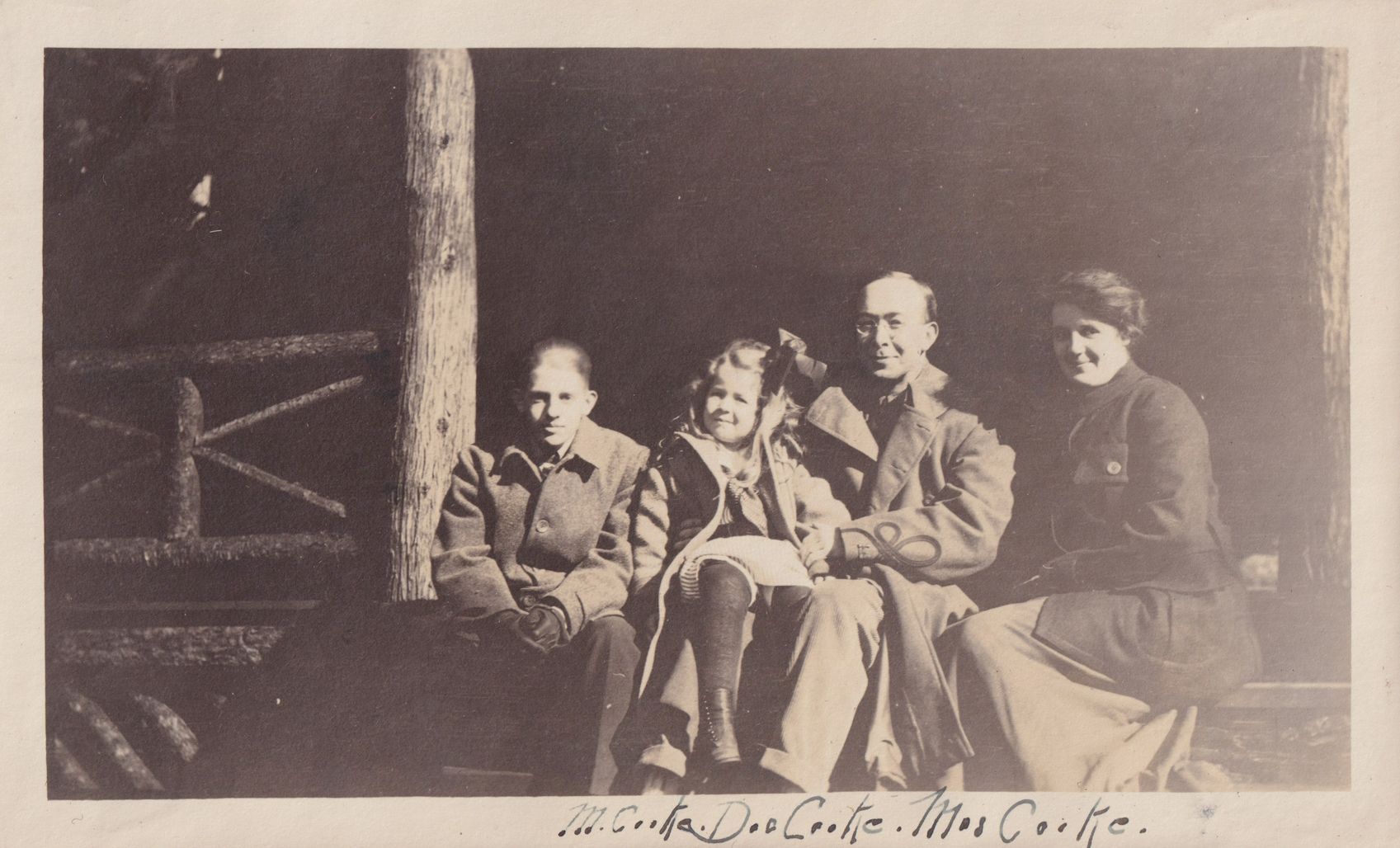 Black-and-white photograph of two men, one girl, and one woman sitting on the front steps of a house's porch. The columns holding up the roof of the porch and the accompanying fence have a very rustic style and appear to be made out of peeled logs. "M. Cooke, Doc Cooke, Mrs Cooke" is written in ink at the bottom of the photograph.