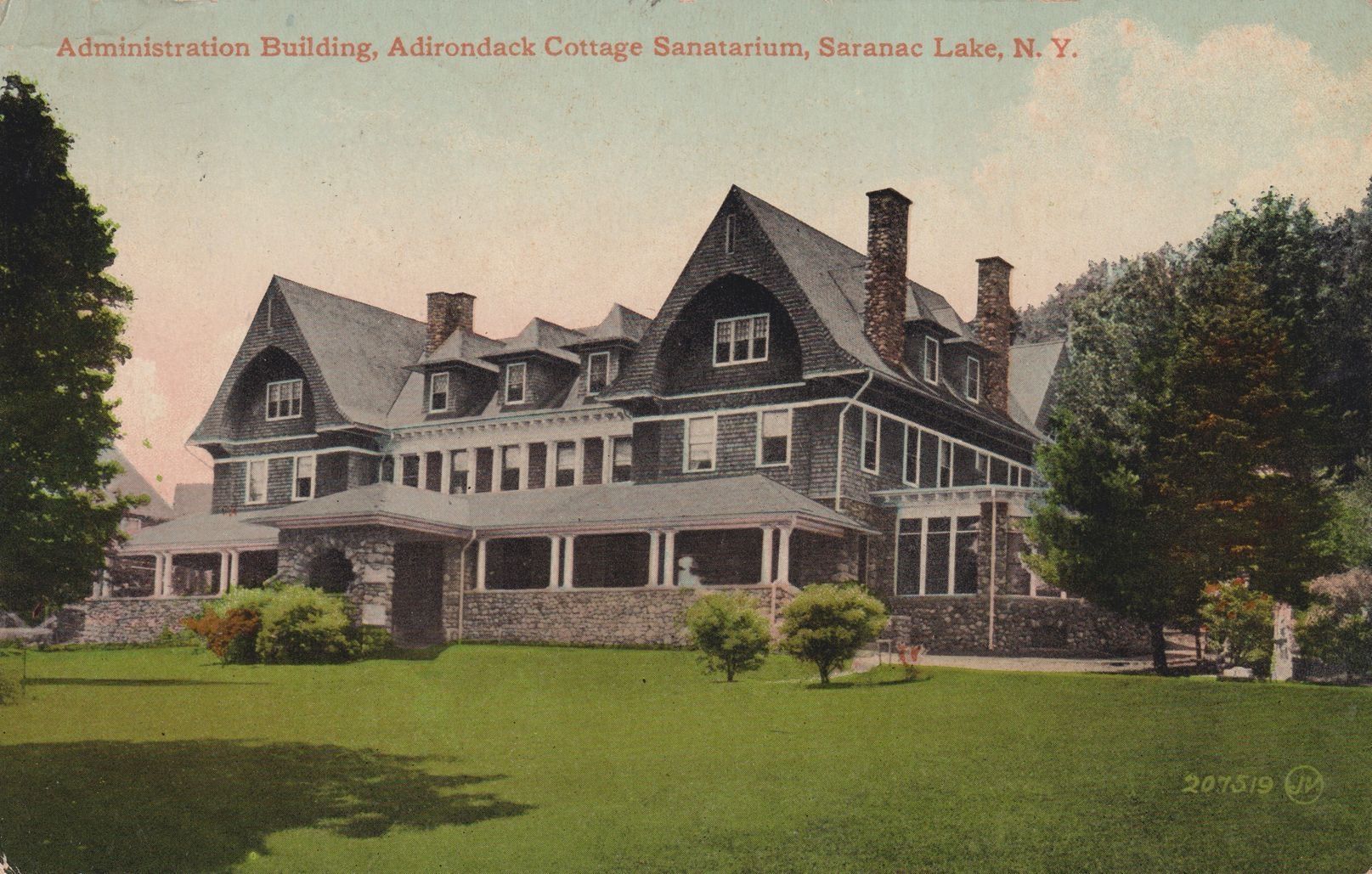 Color postcard showing the Main/Administration Building at the Adirondack Cottage Sanitarium [later Trudeau Sanatorium]. Printed caption on front reads, "Administration Building, Adirondack Cottage Sanatarium, Saranac Lake, N. Y." Printed by the Valentine & Sons' Publishing Co., Ltd., New York. Used, divided back, postmarked Ray Brook, NY, September 26, 1919 [?].