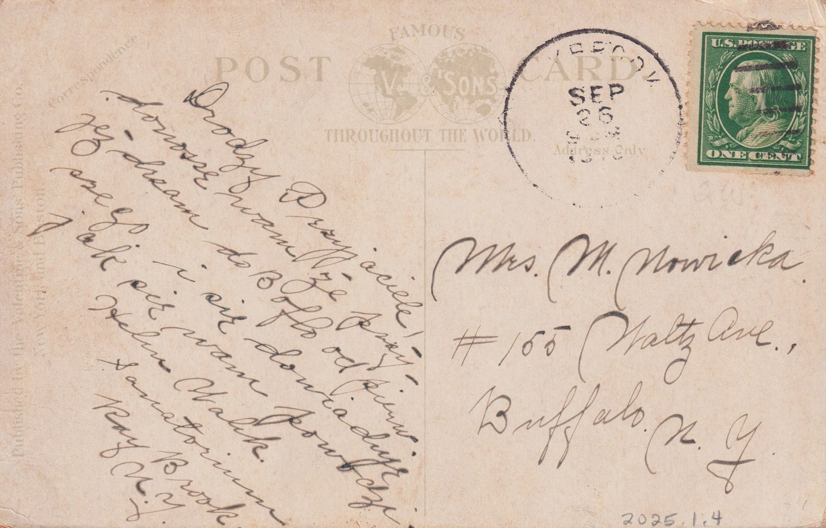 Handwritten message on reverse is in Polish. Translated it reads, "My friends, I want to tell you I will be coming to Buffalo. Tell everyone I will see you. Helen Walik, Sanatorium Ray Brook, N. Y." Mailed to Mrs. M. Nowicka, #155 Woltz Ave., Buffalo, NY.Subject Place