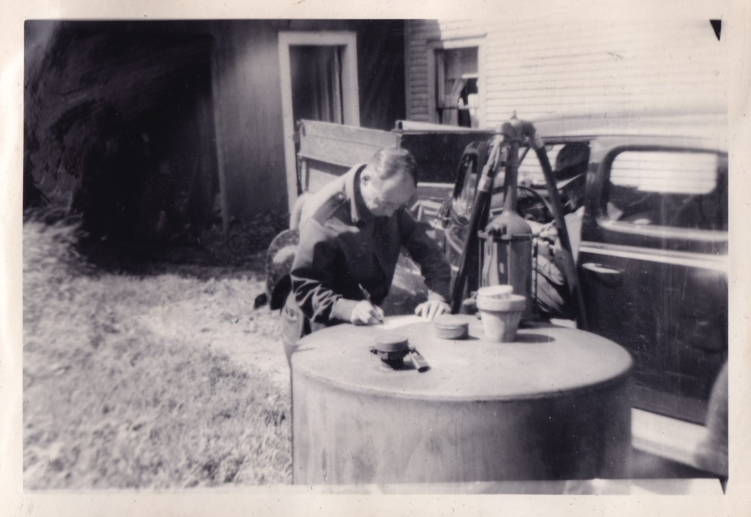 Black-and-White photograph of a man in a game warden uniform leaning over to write on a piece of paper outdoors.
