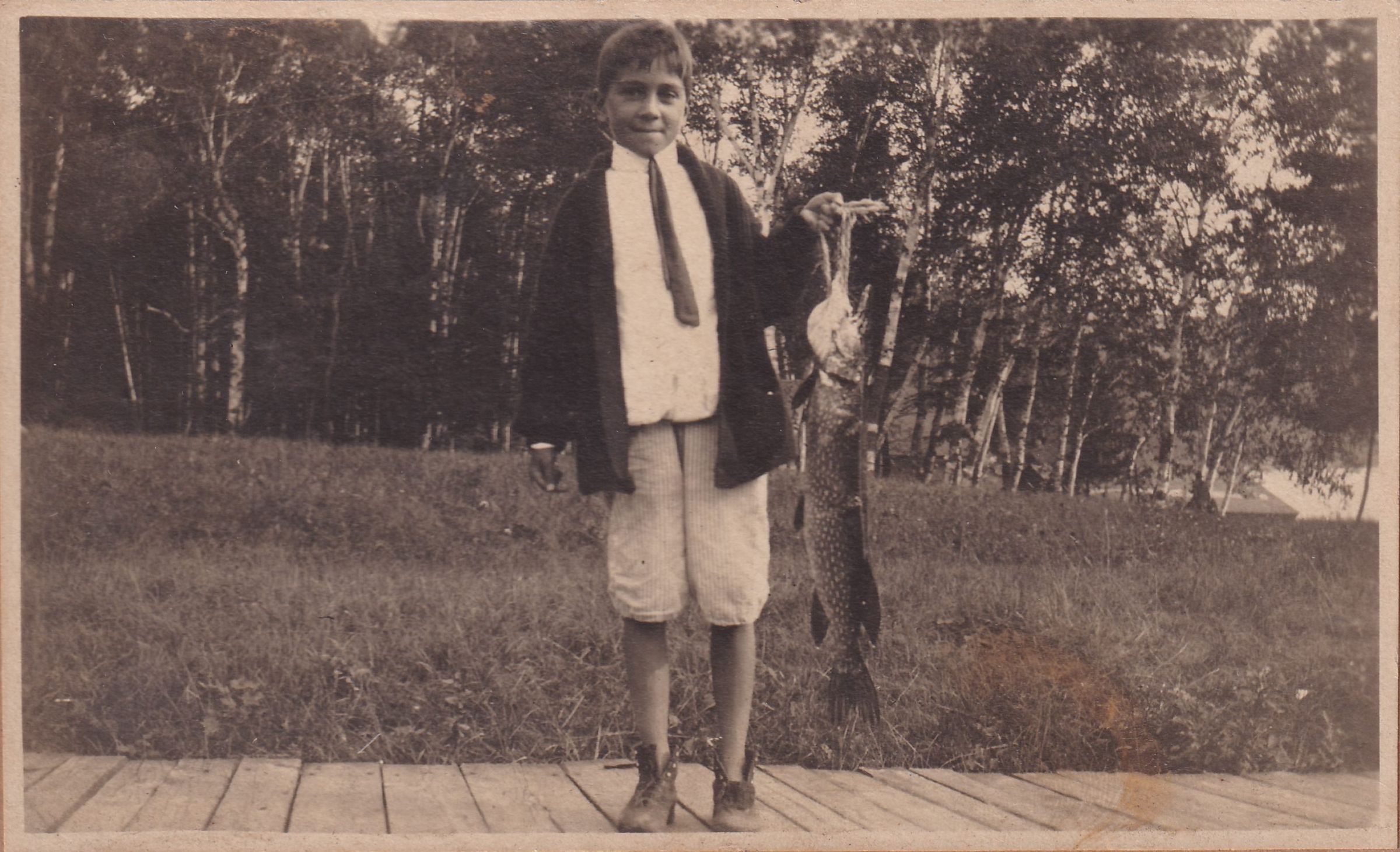 Handwritten note on reverse reads, “holding a 5 1/2 lb Pickerel fish he caught trolling on Lower Saranac Lake, N.Y., August 1915.” Attached to light brown mat.