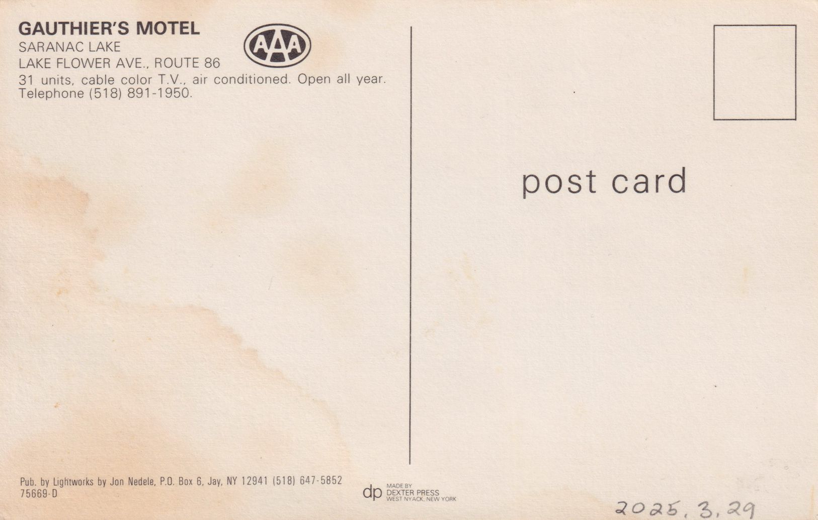 Color postcard showing four views of the Gauthier's Motel property. Printed caption on reverse reads, "Gauthier's Motel." Printed by Dexter Press. Unused, divided back.Subject Person/Organization