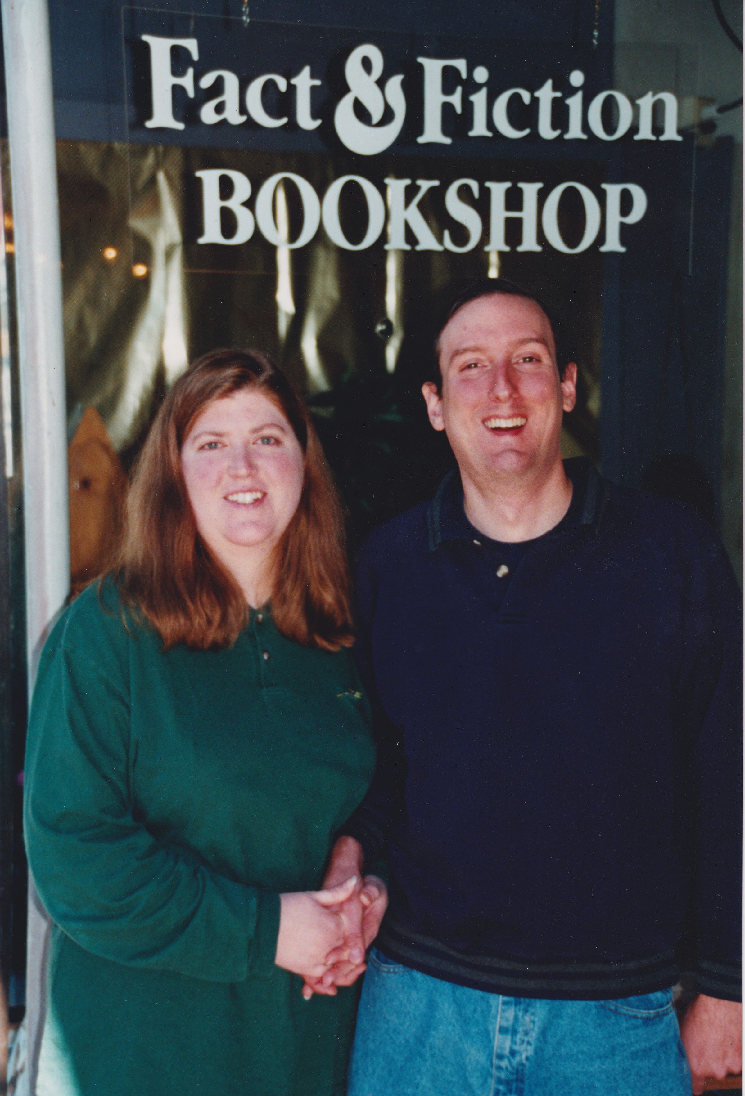 Color photograph of Carrie and Matthew Locatelli in front of the store window outside of their business, Fact & Fiction Bookshop. Portrait taken by Mary Lou Hanpeter Banks as part of her Soul Proprietor exhibition.