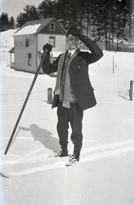 Negative of Dr. Edward R. Baldwin outside on skis. He is holding one ski pole and wearing a suit, scarf, and pointed hat. There is a house in the background behind him. Most likely taken by Mary Ives Baldwin. This item is not fully cataloged but has been uploaded so the image is publicly available; if you would like us to prioritize cataloging this item, please contact the HSL Collections team.