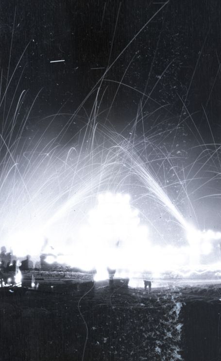 Negative of an Ice Palace at night with fireworks around it. Spectators are also visible at the bottom of the image. Most likely taken by Mary Ives Baldwin. This item is not fully cataloged but has been uploaded so the image is publicly available; if you would like us to prioritize cataloging this item, please contact the HSL Collections team.