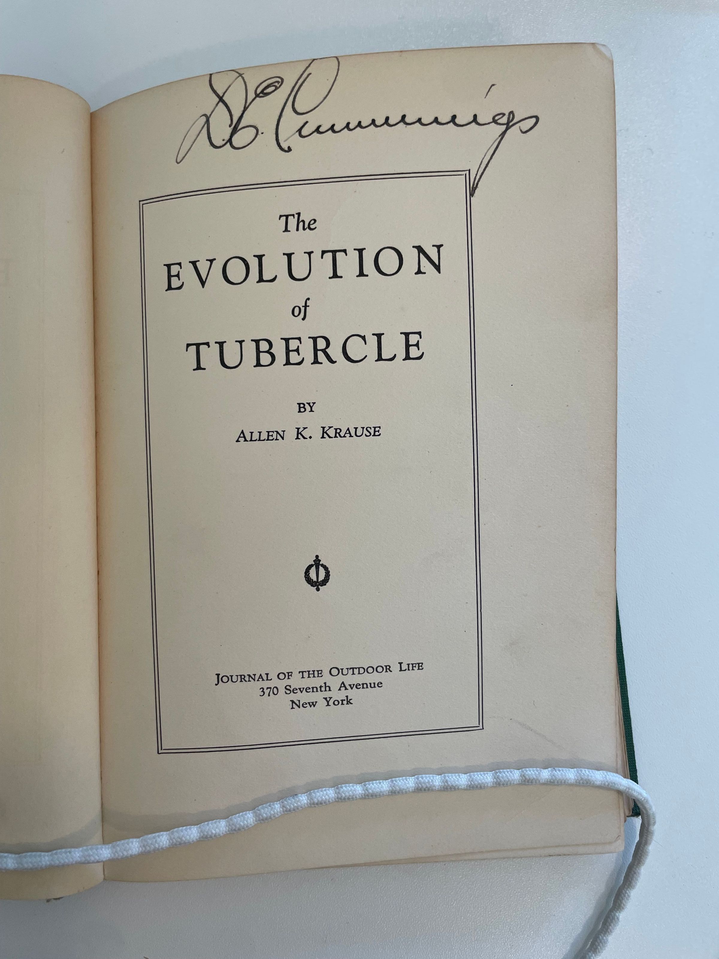The Evolution of Tubercule by Allen K. Krause. Originally an address on a research project, "The Anatomical Structure of Tubercule from Histogenesis to Cavity," delivered at the Fifth Conference of the International Union Against Tuberculosis, Washington, D. C., October 1, 1926. Published by the Journal of the Outdoor Life, New York. Hardcover, 95p. Has "D. C. [?] Cummings," inscription on title page.Lexicon