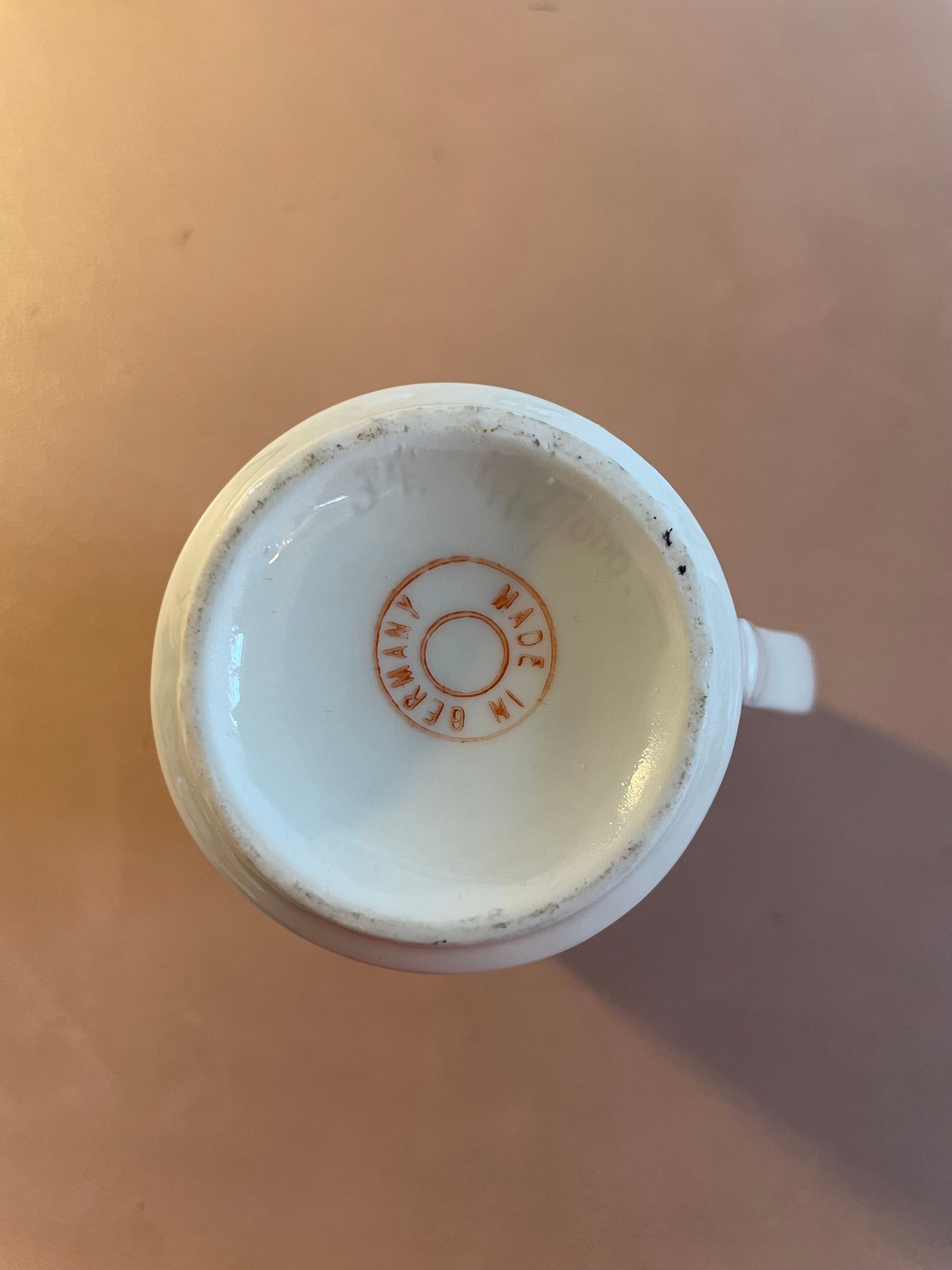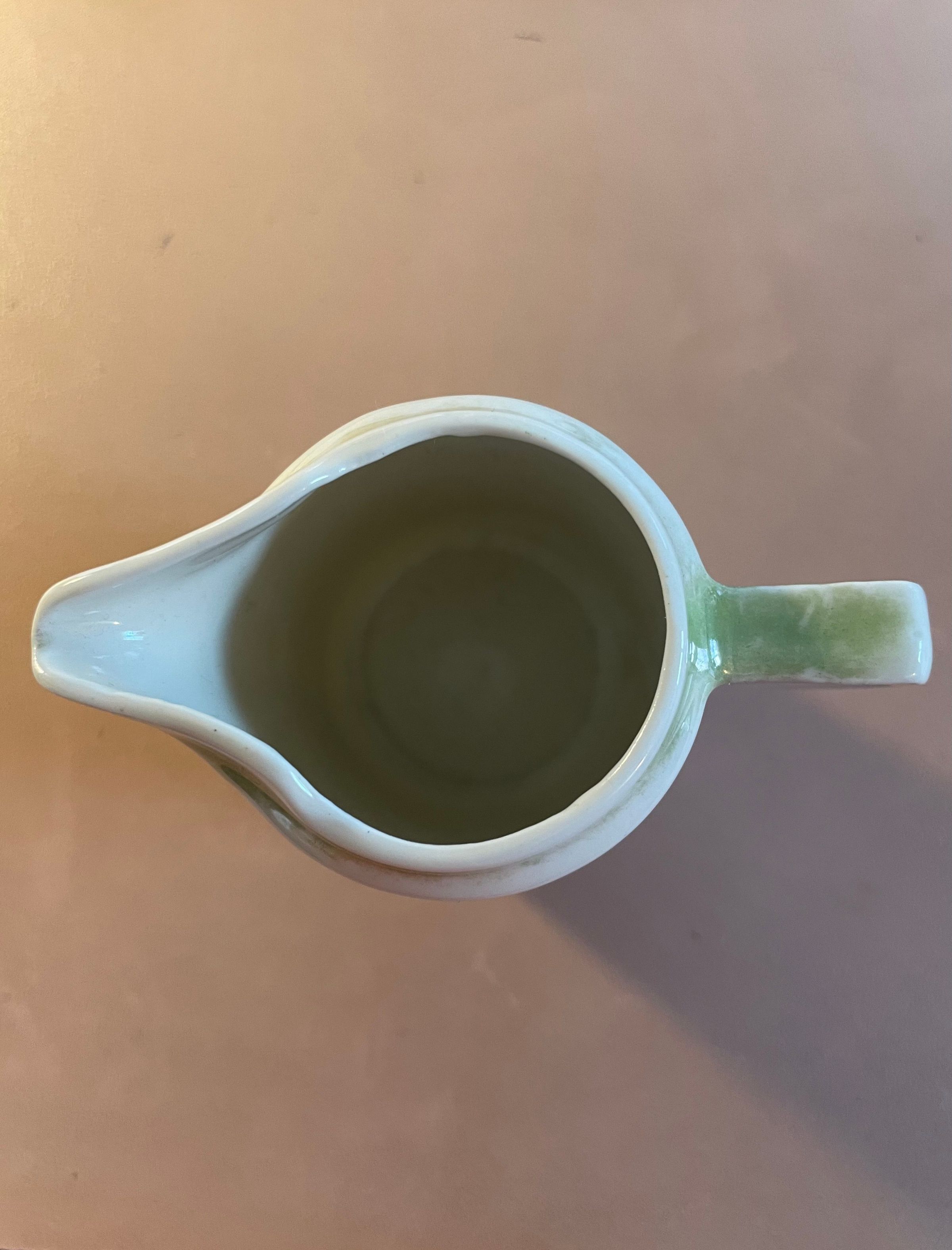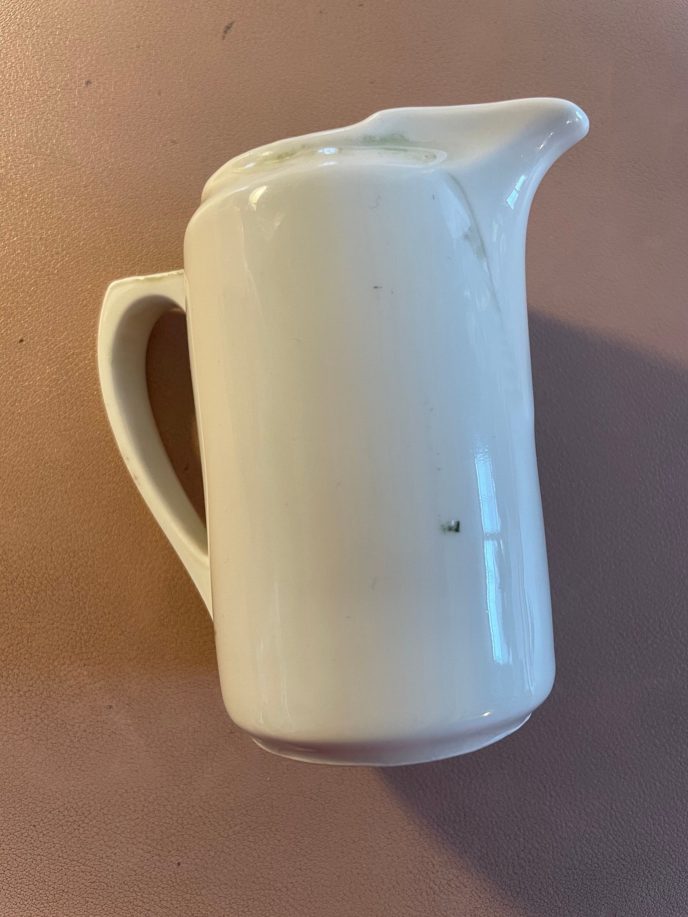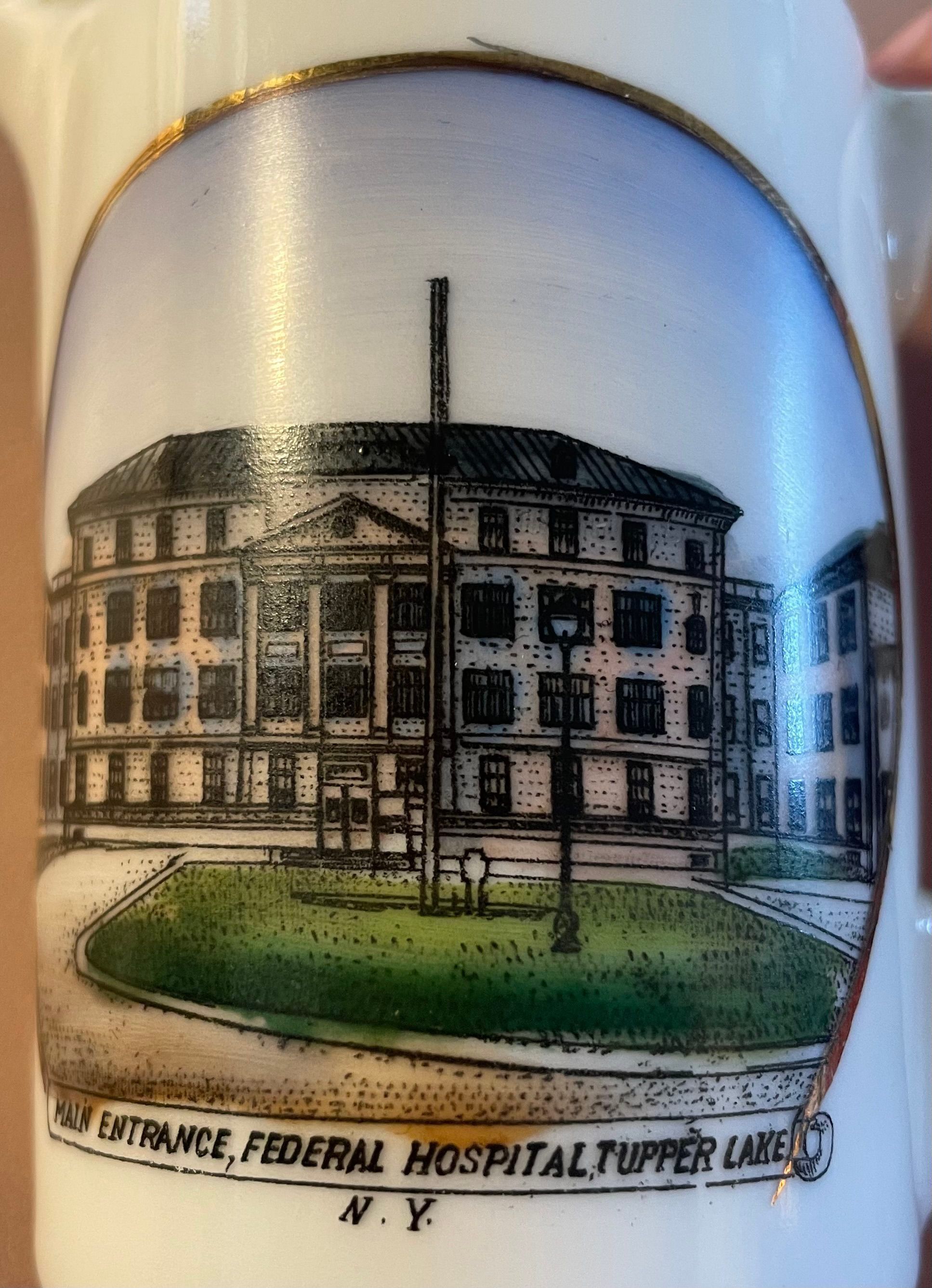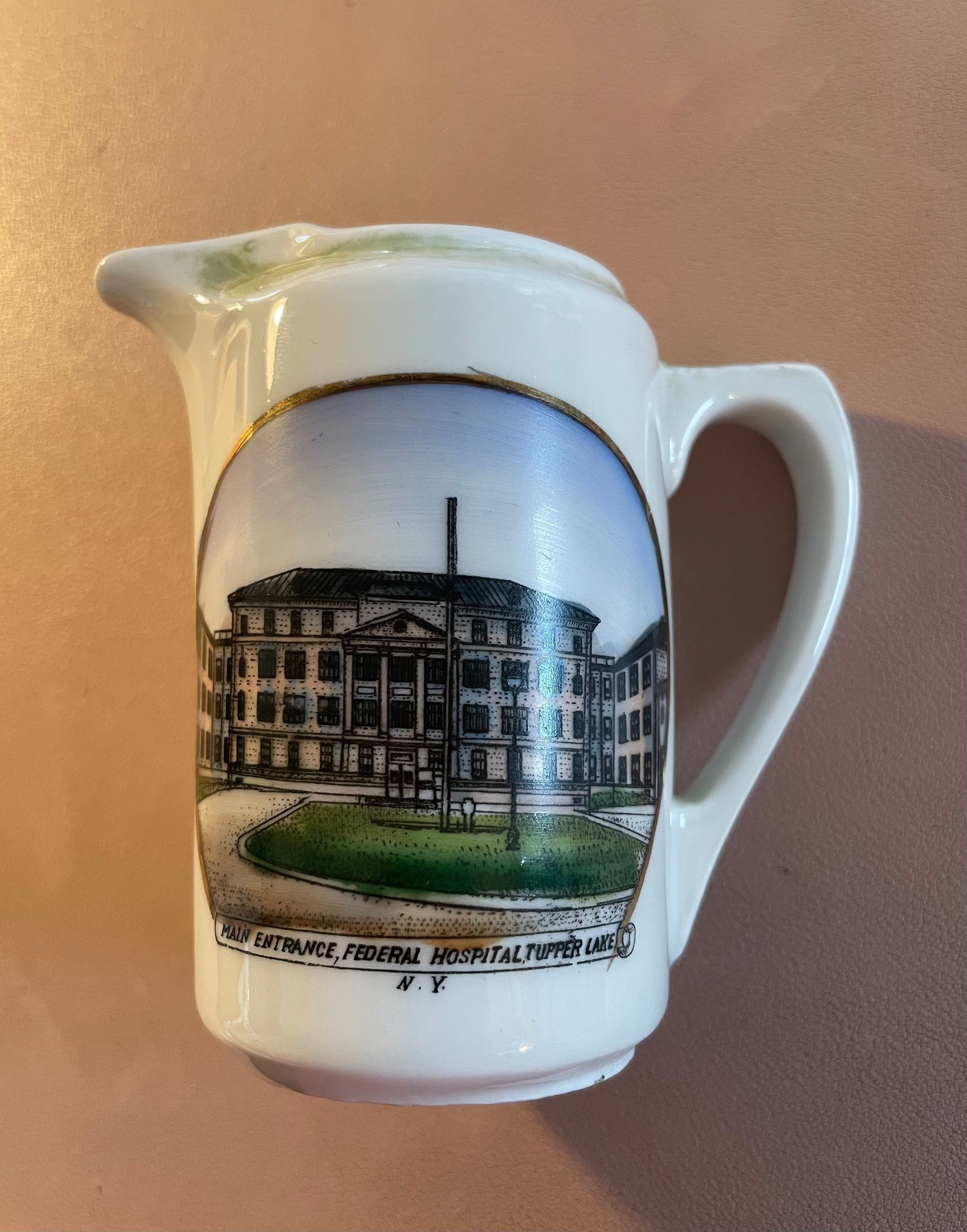 Ceramic souvenir cream pitcher featuring a colored drawing of the Veterans Administration Tuberculosis Hospital in Tupper Lake. Printed caption under image reads, "Main Entrance, Federal Hospital Tupper Lake, N. Y." Drawing is circled by gilt border, and opening and handle of pitcher are tinted green. "Made in Germany," is stamped on bottom.Collection