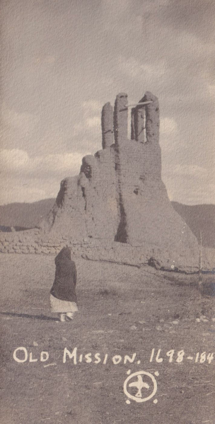 Black-and-white photo postcard of a tall adobe structure with a piece of wood joining two of four columns at the top. "Old Mission, 1698-184" is printed on the photo in white.