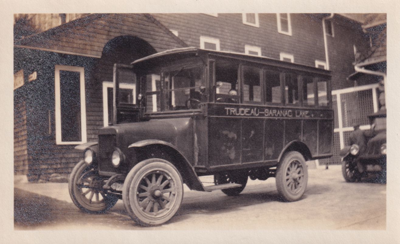 Black and white photograph of the Trudeau Bus in front of the Post Office behind the Administration Building at the Trudeau Sanatorium.