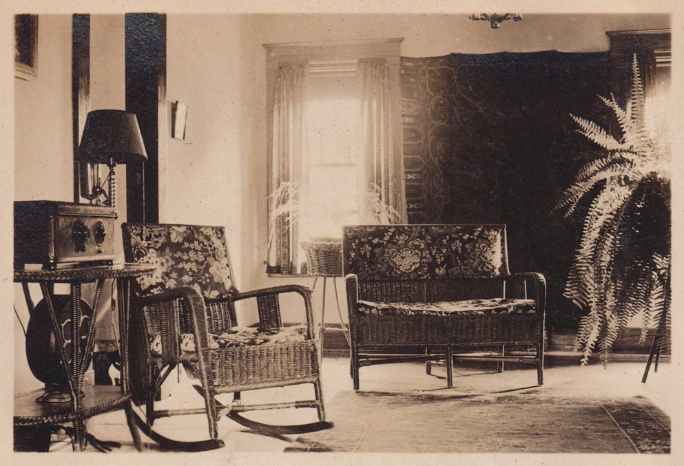 Black-and-White photograph of the living room of the second residence of the Jones Family in Saranac Lake, an unidentified cure cottage on Lake Street. It may be 453 Lake Street. The cottage was rented furnished.