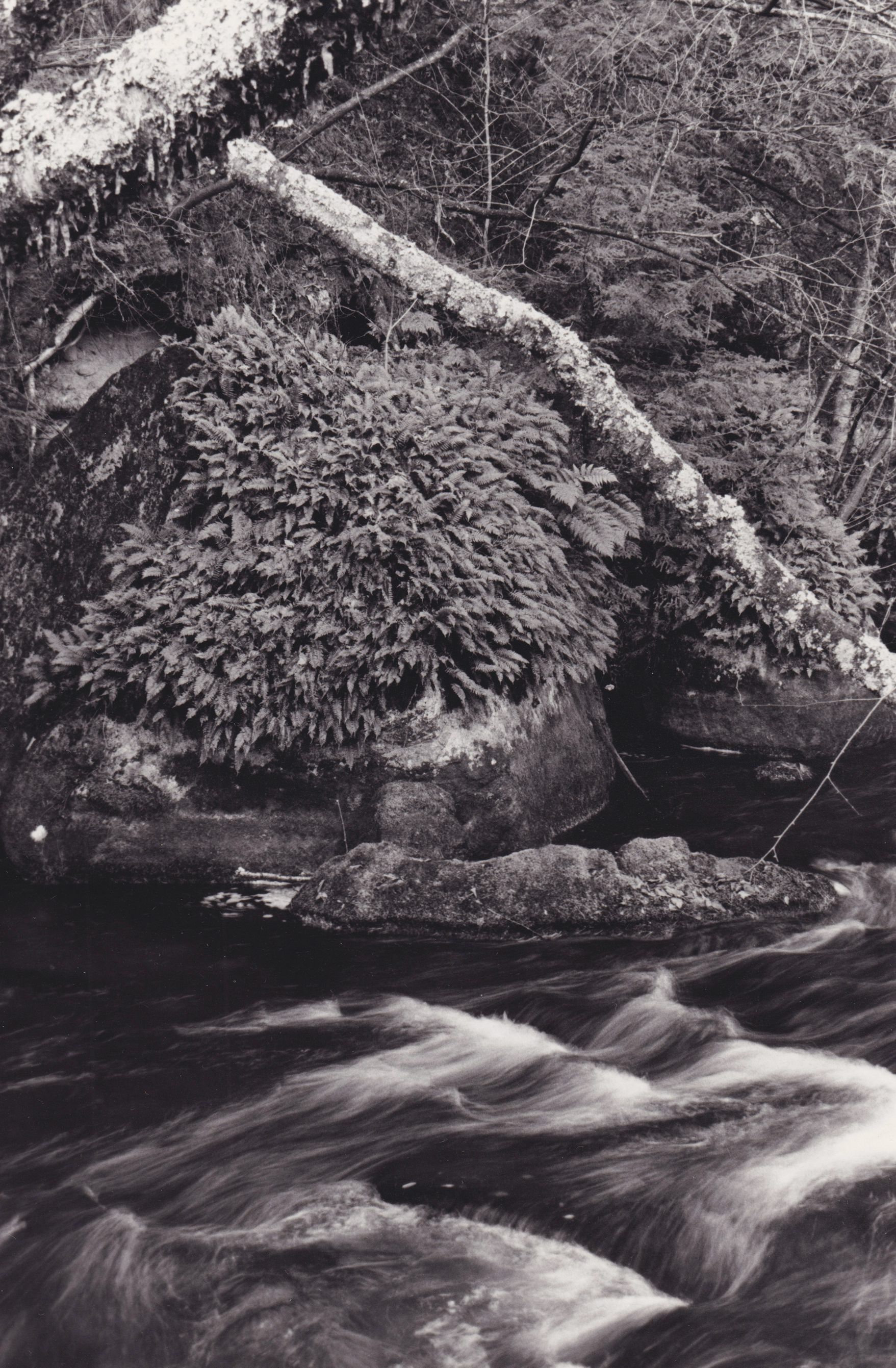 Black-and-White photograph of ferns growing on boulders along a stream near Bartlett Carry Club.
