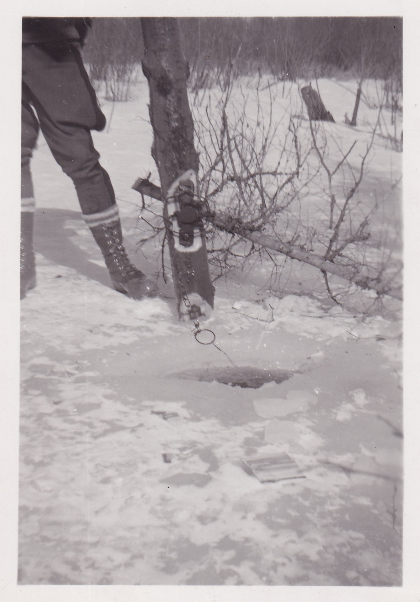 Black-and-White photograph of a trap mounted on a large wooden stick. The trap is connected to a hole in the ice.