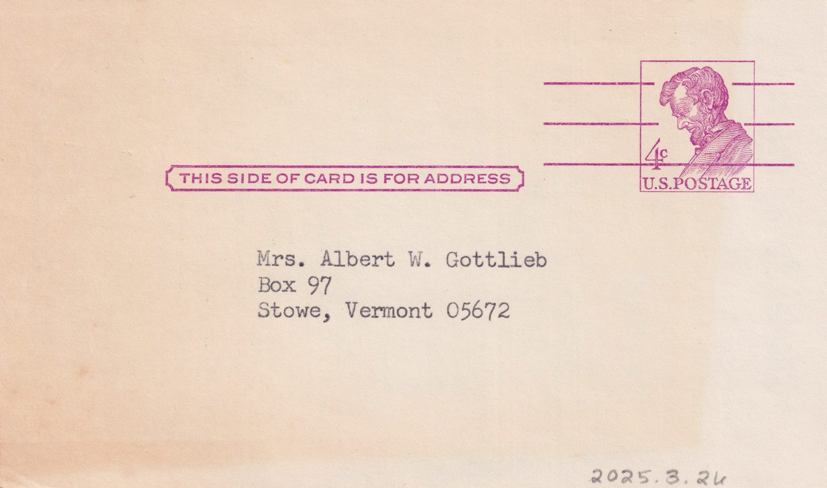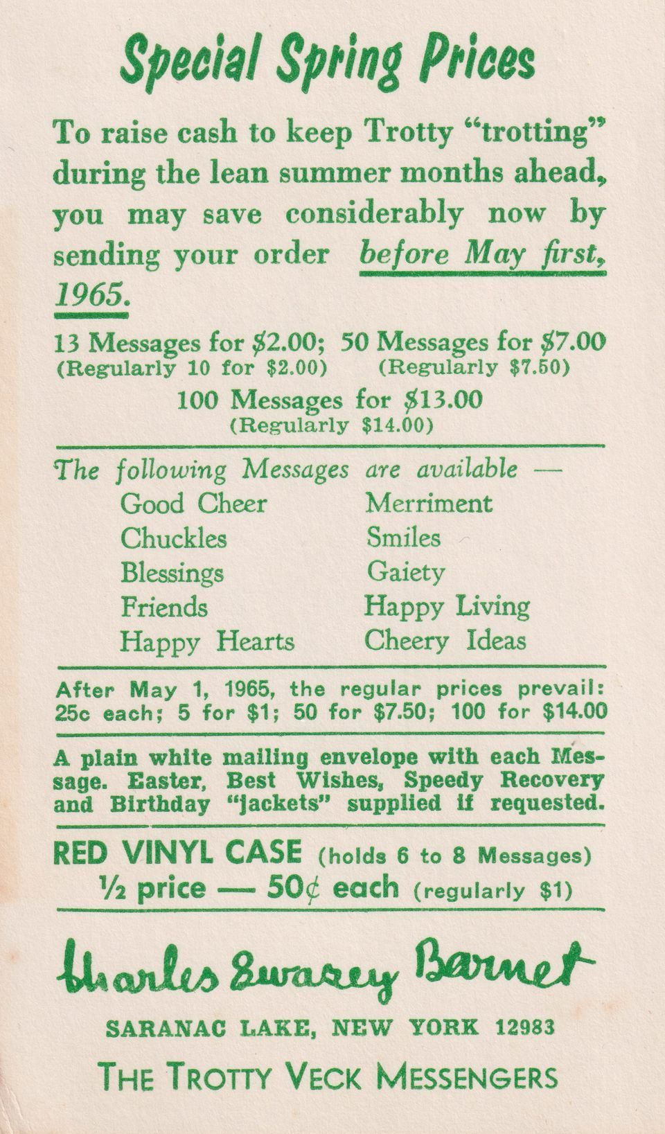 Advertising postcard for the Trotty Veck Messengers. Printed in green ink on white background. Details "Special Spring Prices," for Trotty Veck purchases (including bulk purchases) prior to May 1, 1965. Printed with "signature" of Charles Swasey Barnet. Addressed to Mrs. Albert W. Gottlieb, Box 97, Stowe, VT 05672.Subject Person/Organization