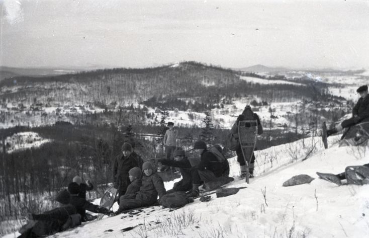 Negative of a group of snowshoers on the side of a hill. Some are sitting and some are standing. Most likely taken by Mary Ives Baldwin. This item is not fully cataloged but has been uploaded so the image is publicly available; if you would like us to prioritize cataloging this item, please contact the HSL Collections team.
