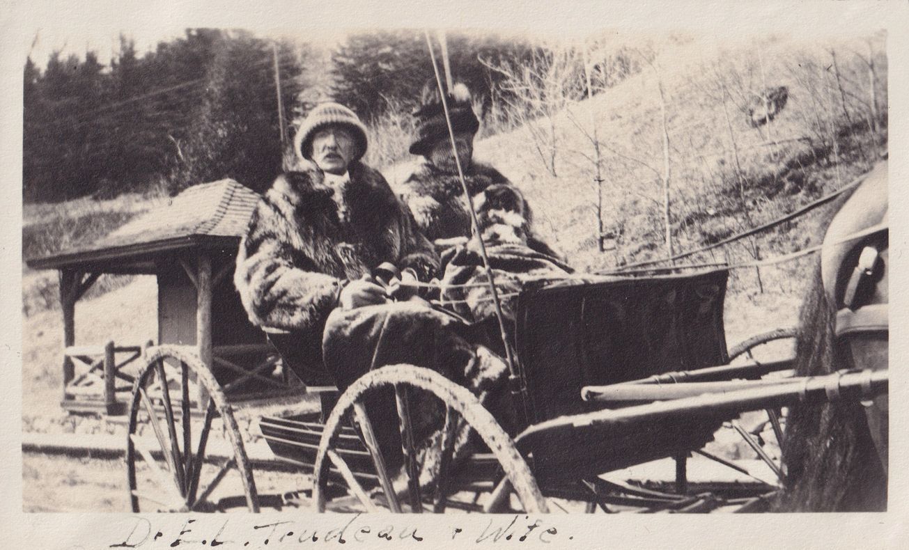 Black-and-white photograph of Edward Livingston Trudeau and Charlotte Beare Trudeau sitting in a horse drawn carriage while wearing winter gear. There is ice on the carriage wheels. "Dr. E.L. Trudeau + Wife" is written in ink at the bottom of the photograph.