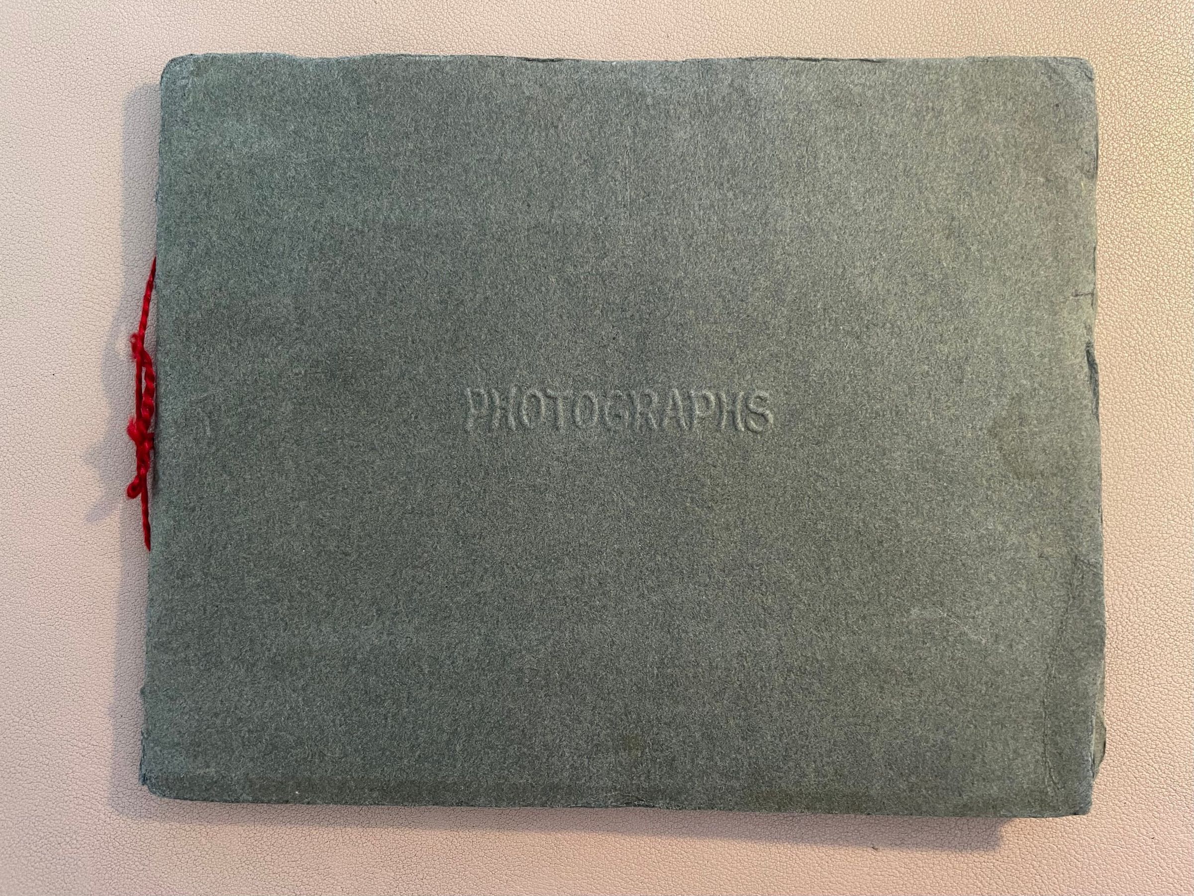 Gray paper photograph album bound with red string, with "Photographs" embossed on the front cover. The album contains seven black-and-white photographs held in by black paper "frames." See 2009.2.8.1 - 2009.2.8.7 for images contained in album.