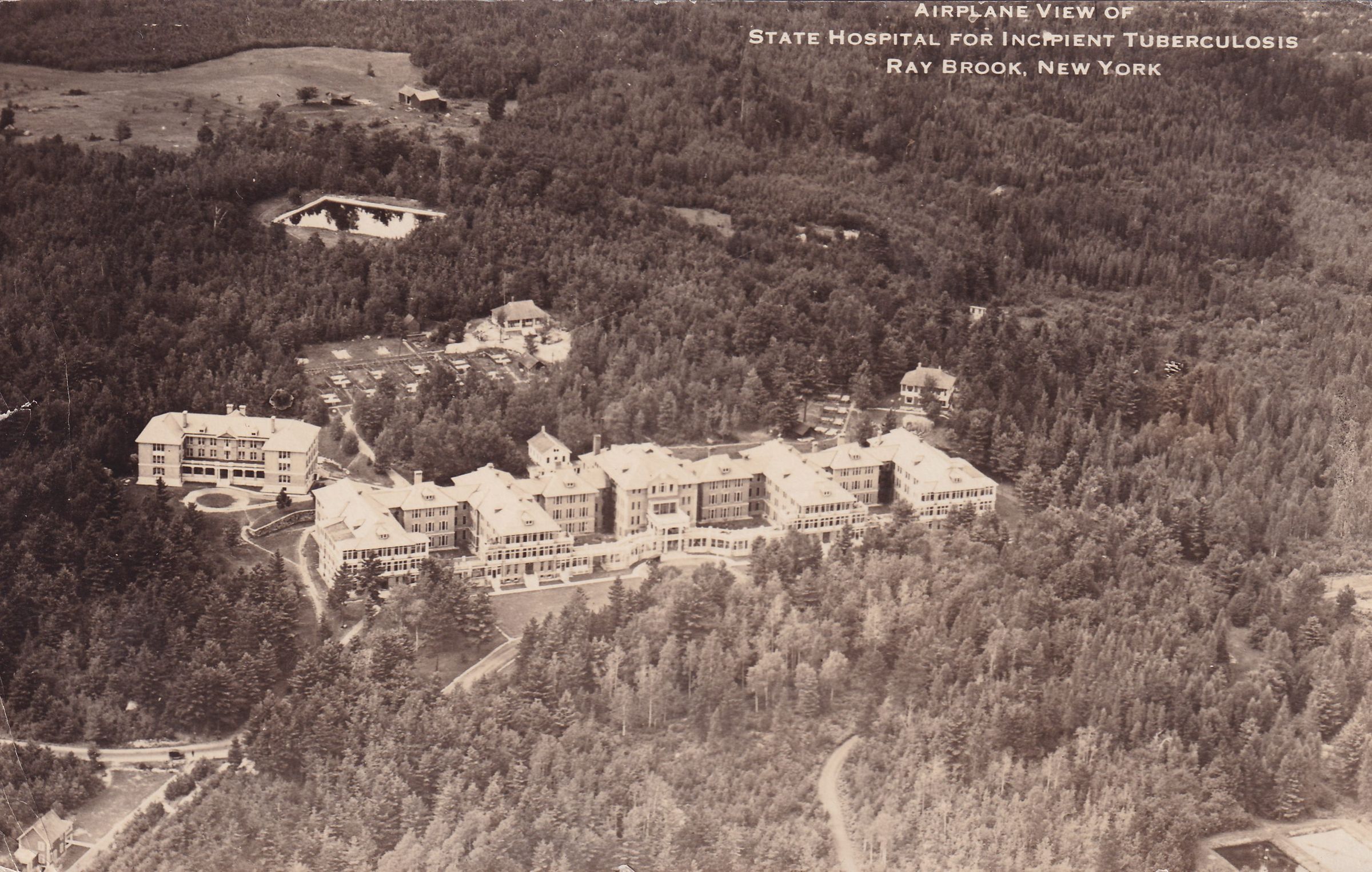 Photograph postcard showing an aerial view of the New York State Sanatorium for Incipient Tuberculosis, AKA Ray Brook Sanatorium. The Infirmary Building, reservoir, and other structures are visible behind the Main Building. Printed caption on ”Airplane View of State Hospital for Incipient Tuberculosis, Ray Brook, New York.” No photographer’s mark. Used, divided back, not mailed. Handwritten message on back reads, “Ray Brook N.Y. Dec. 18. 1927. Dear friends. I often think of you but writing letters is the biggest job I do and I neglect my own people. I am well as ever and as far as I know-all of mine. My brother's on Madagascar lost the little girl [?] Asged was her name shortly after they came down there again. But most likely you hear from Berta yourself occasionally. She is a good writer. -- I wonder how you all are Ruth and Dorothy grown up ladies I suppose. How time flies 2 years. and a half--soon 3 year since I was in Minneapolis. My aunt died last spring. Now there is left only one, the youngest, of those sisters and brothers. My father has 2 brothers and a sister alive yet, and father is 82 years old. Nilsens are remarkably well considering what they have gone thru. I wish you all a pleasant Christmas and a happy New Year. Martha Asolas. I thought you might like to see this place looks.”Subject Place