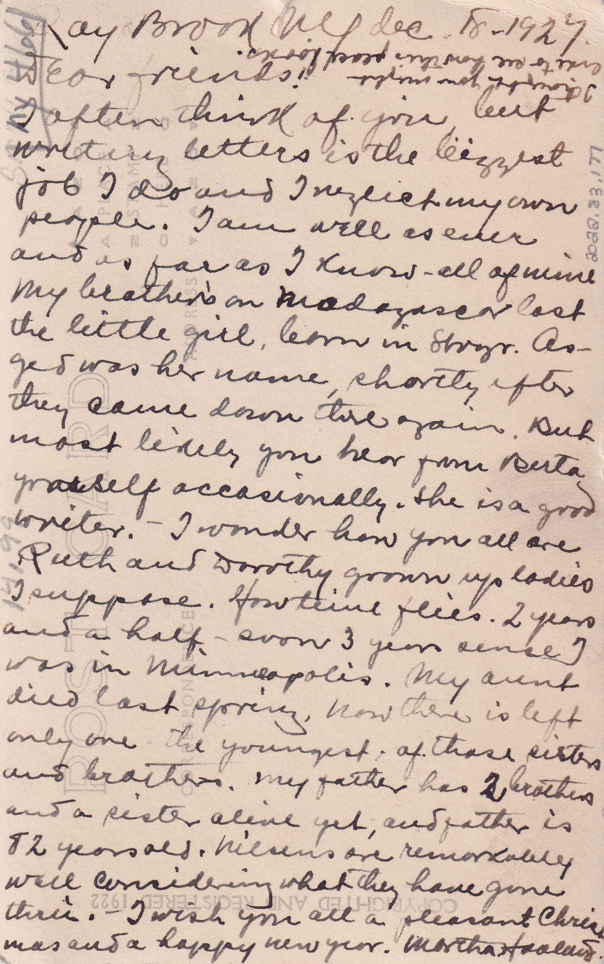 Ray Brook N.Y. Dec. 18. 1927. Dear friends. I often think of you but writing letters is the biggest job I do and I neglect my own people. I am well as ever and as far as I know-all of mine. My brother's on Madagascar lost the little girl [?] Asged was her name shortly after they came down there again. But most likely you hear from Berta yourself occasionally. She is a good writer. -- I wonder how you all are Ruth and Dorothy grown up ladies I suppose. How time flies 2 years. and a half--soon 3 year since I was in Minneapolis. My aunt died last spring. Now there is left only one, the youngest, of those sisters and brothers. My father has 2 brothers and a sister alive yet, and father is 82 years old. Nilsens are remarkably well considering what they have gone thru. I wish you all a pleasant Christmas and a happy New Year. Martha Asolas. I thought you might like to see this place looks.Transcriber