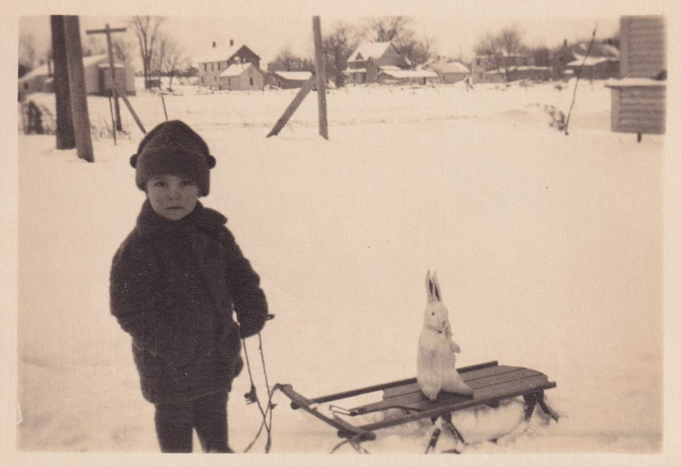 Black-and-White photograph of an unidentified child with a sled in the snow. There is a stuffed rabbit sitting on the sled, and the backs of several houses are visible in the distance. The photograph was likely printed by Kollecker's Kodak and Gift Shop.