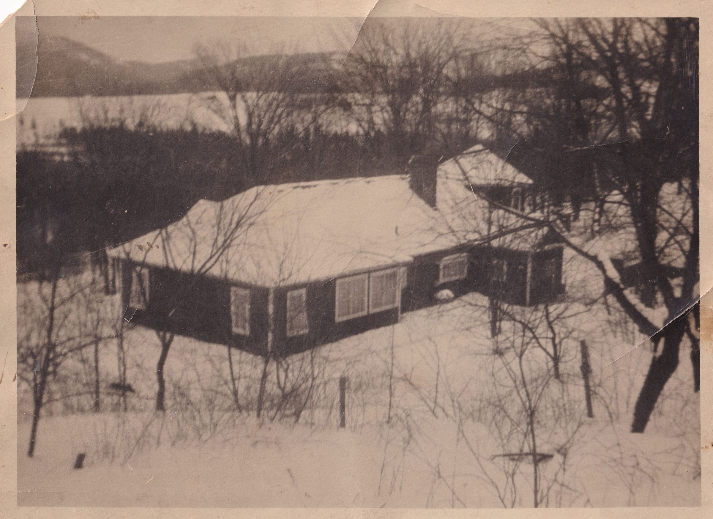 Black-and-White photograph of Hillside Lodge in the snow from the rear.