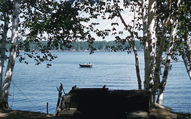 Color Kodachrome slide showing a body of water between birch trees. This item is not fully cataloged but has been uploaded so the image is publicly available; if you would like us to prioritize cataloging this item, please contact the HSL Collections team.