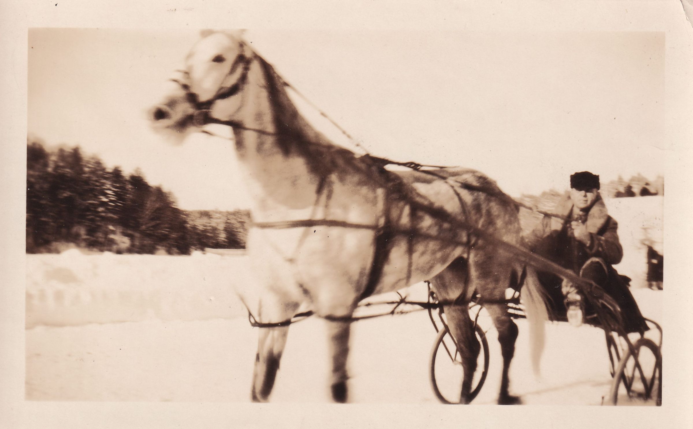 Black-and-White photograph of a man harness racing during Winter Carnival. A spotted horse is pulling the cart. Handwritten on reverse: "Saranac Lake Winter Carnival."