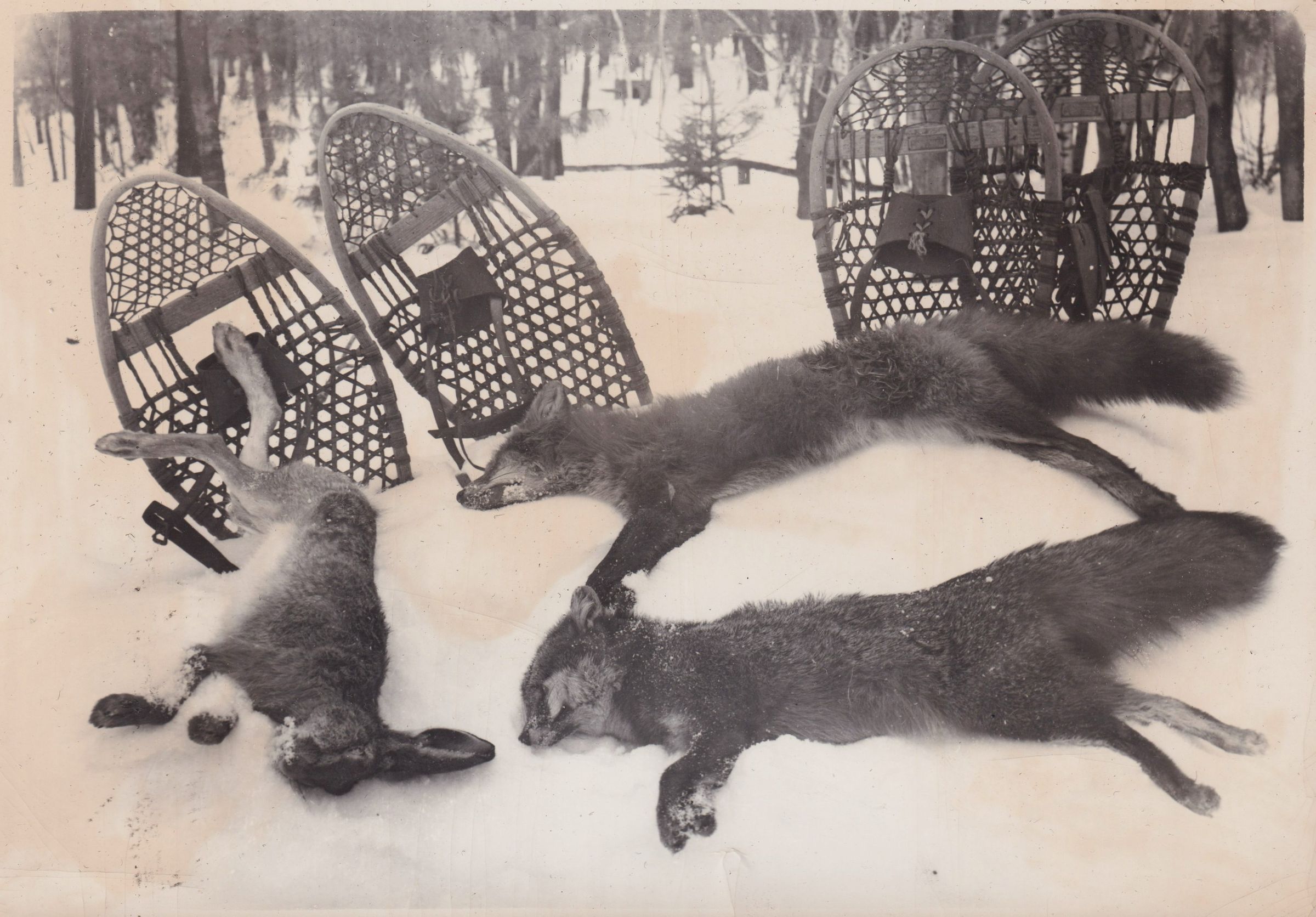 Black-and-White photograph of two dead foxes and a hare laid out in the snow. There are two pairs of snowshoes stuck in the snow behind them.
