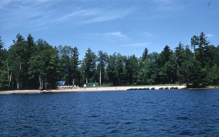 Color Kodachrome slide showing the beach at what is likely Eagle Island camp, seen from the water. Printed caption on front reads, "Girls Camp Upper Saranac." From a group of vacation slides taken by an unidentified family.