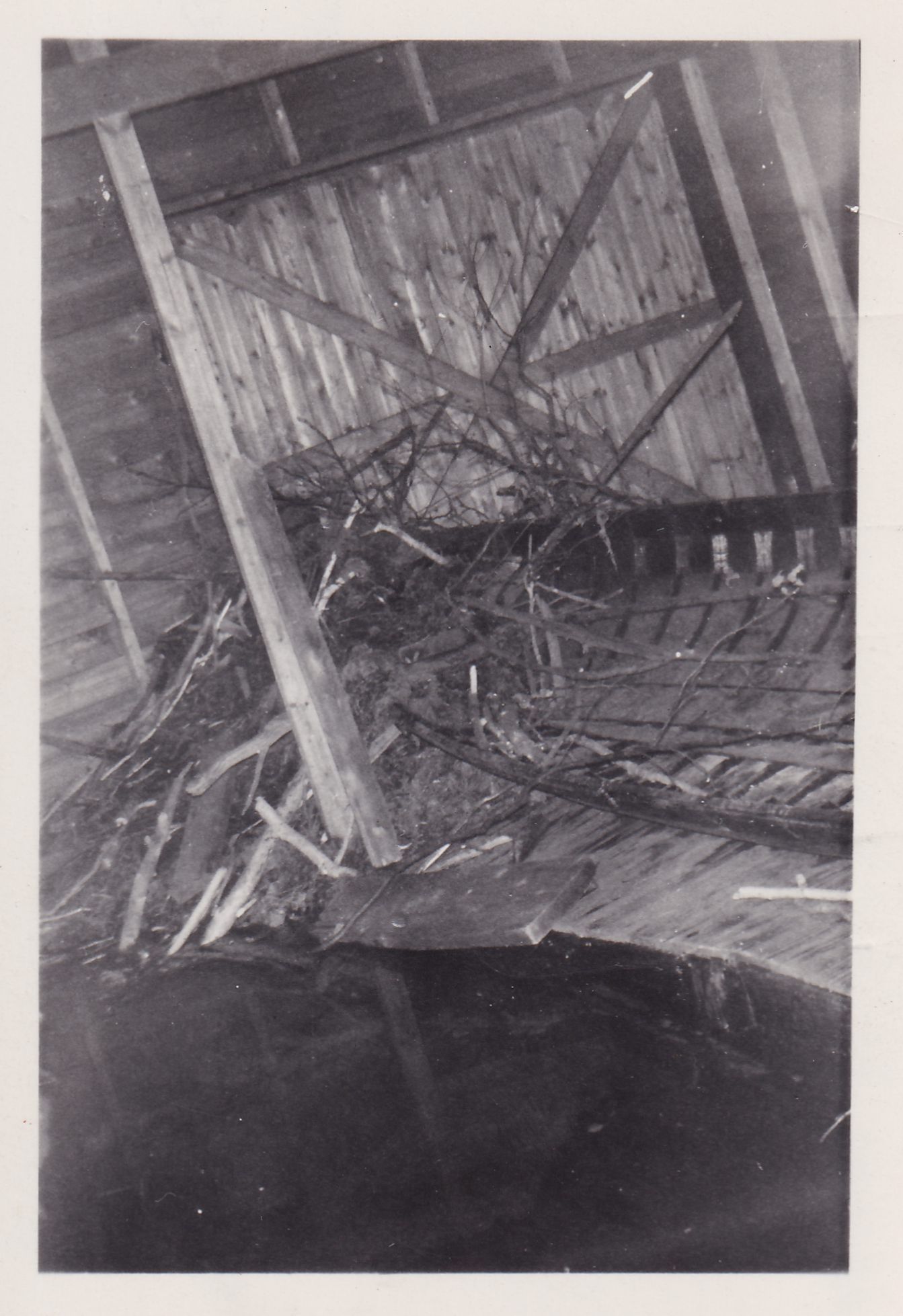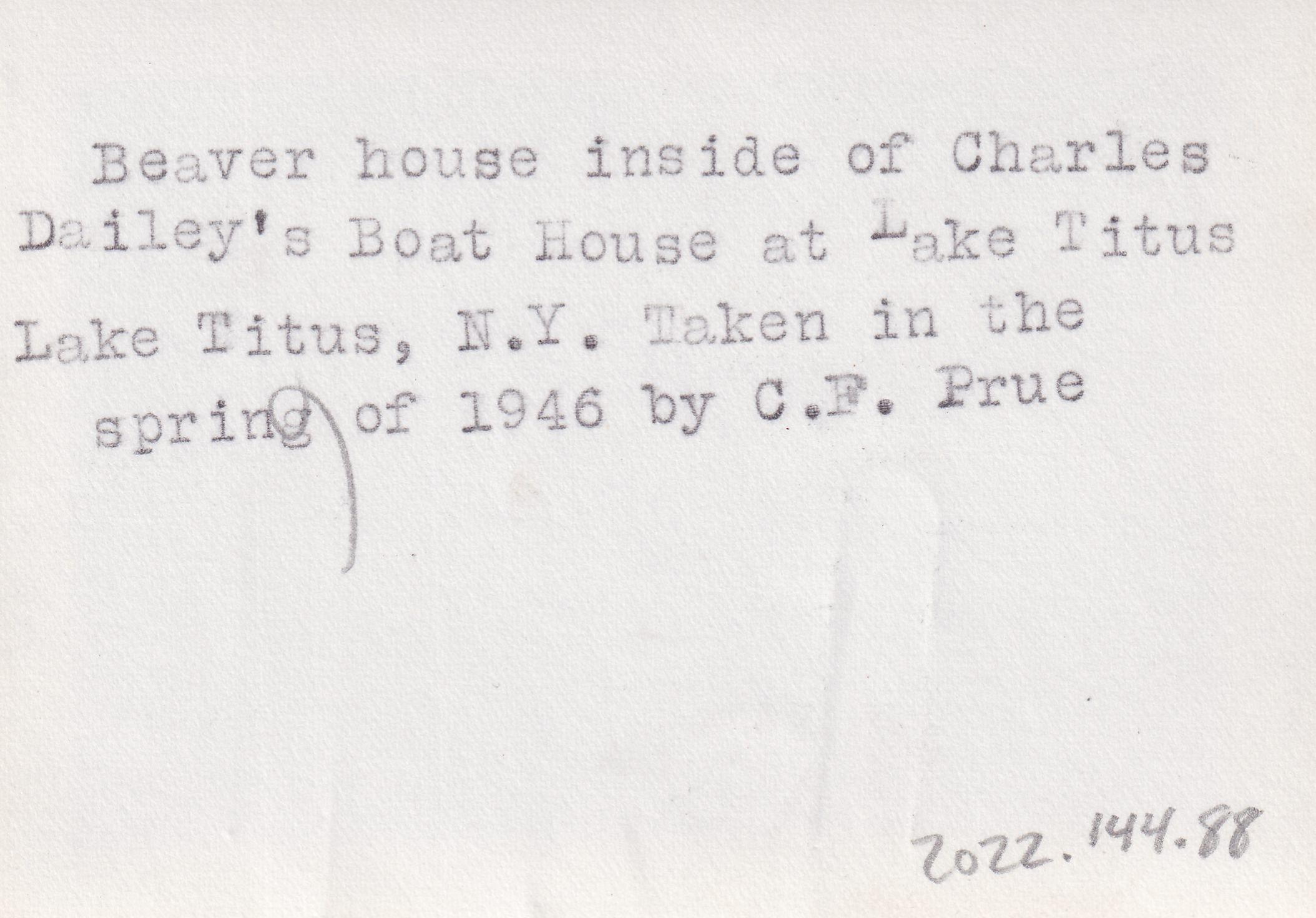 Black-and-White photograph of a beaver lodge on a wooden dock. Typewritten caption on back reads, "Beaver house inside of Charles Dailey's Boat House at Lake Titus. Lake Titus, N. Y. Taken in the spring of 1946 by C. F. Prue."