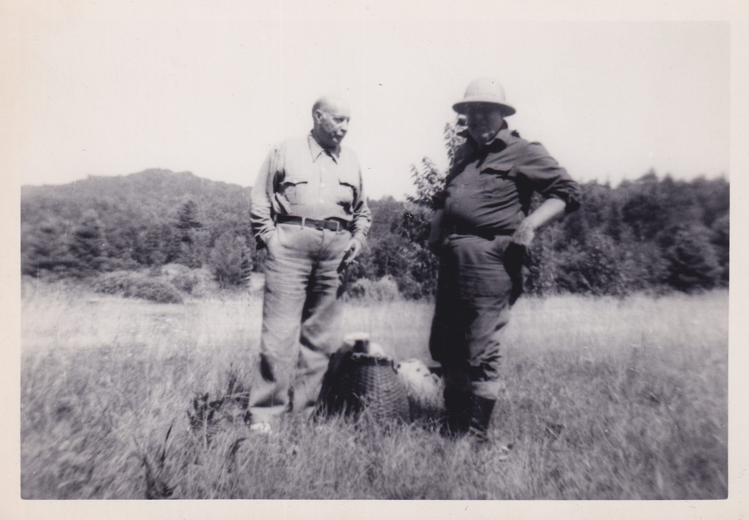 Black-and-White photograph of two men standing in a field. There is a pack basket at their feet. Ray Burmaster is standing at right. [Note: the man at left resembles Charles Trembley but this has not been confirmed.]