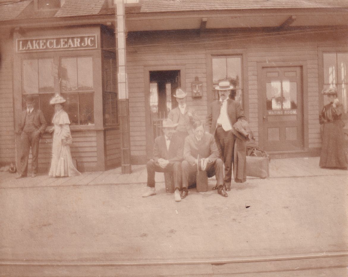 Photograph of a five men sitting outside Lake Clear Junction. There is a couple standing against the window of the train station and one individual woman by the door to the waiting room. The train tracks can be seen at the bottom of the frame.